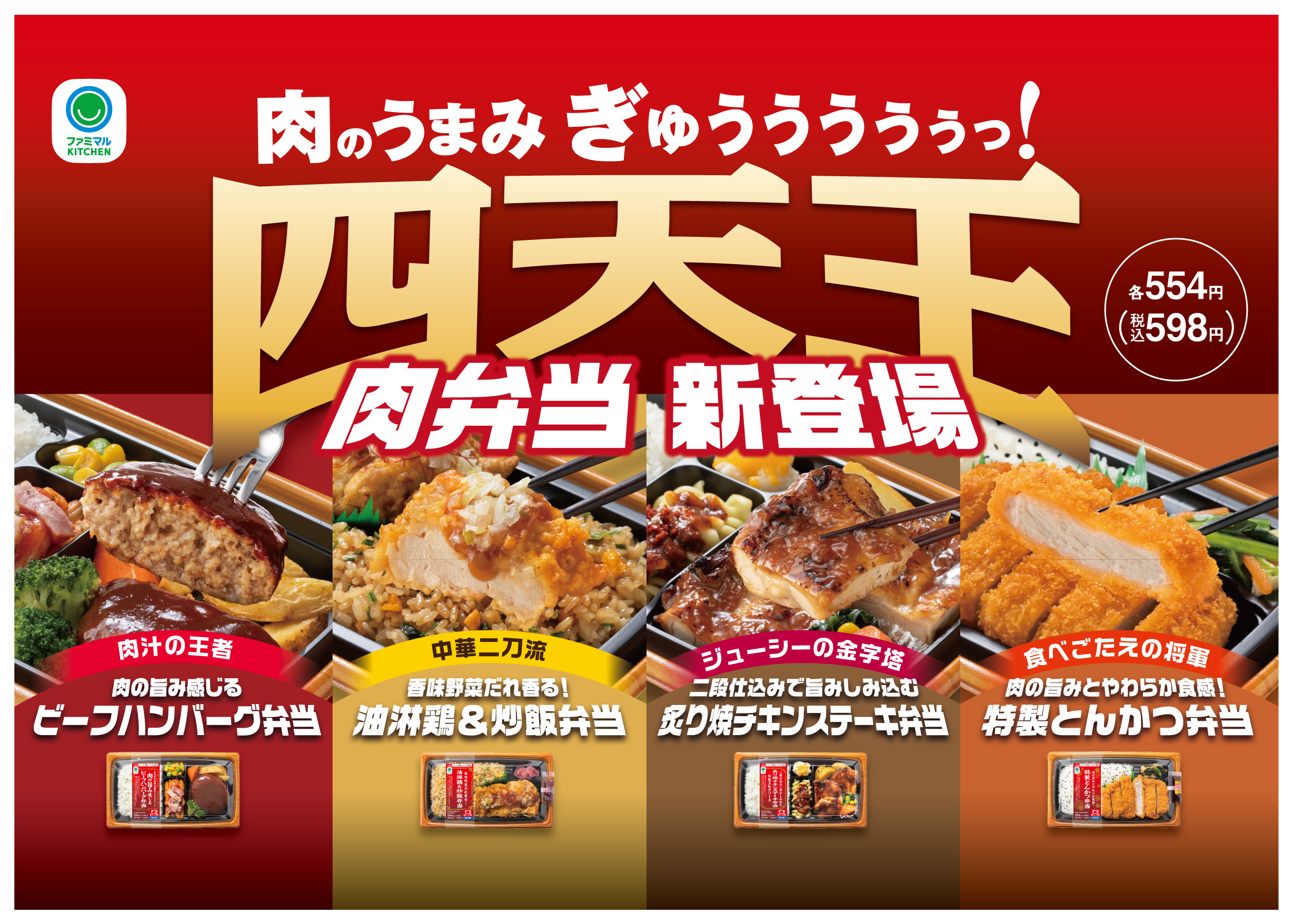 このたびは、「40のいいこと!?」の5つのキーワードの1つである「もっと美味しく」の一環として、昨年10月に誕生した新プライベートブランド「ファミマル」より、肉のうまみにこだわった4種類の弁当「肉弁当 四天王」を発売し、2月8日(火)より全国のファミリーマートでキャンペーンを展開いたします。
