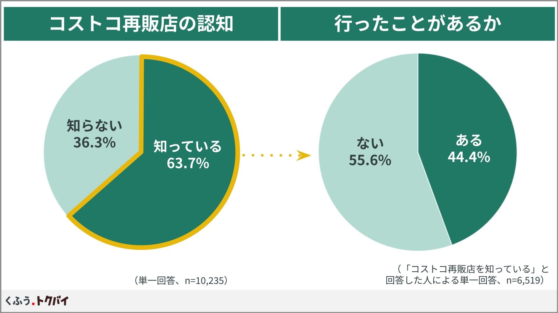 そんな中、注目されているのは、事業者がコストコから仕入れた商品を販売する再販店です。コストコ再販店について約6割(63.7%)が「知っている」と答えました。そのうち、行ったことがある人は約4割(44.4%)です。