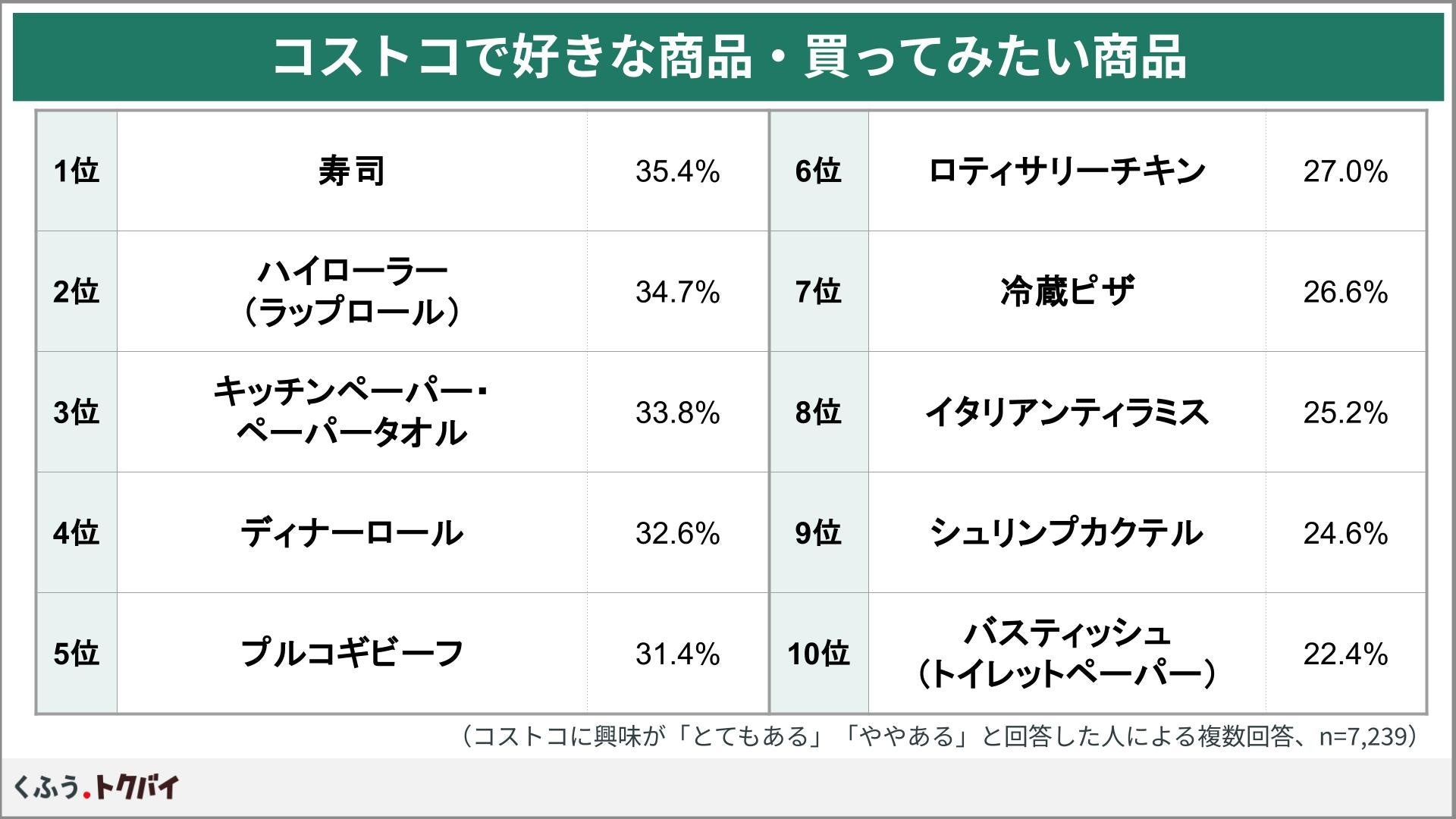 好きな商品、買ってみたい商品をたずねたところ、"コストコといえば"の看板商品が並ぶ中、僅差で「寿司」(35.4%)が1位となりました。デリカ、ベーカリー、簡便調理品、日用品とさまざまなジャンルの人気商品が支持を集めています。
