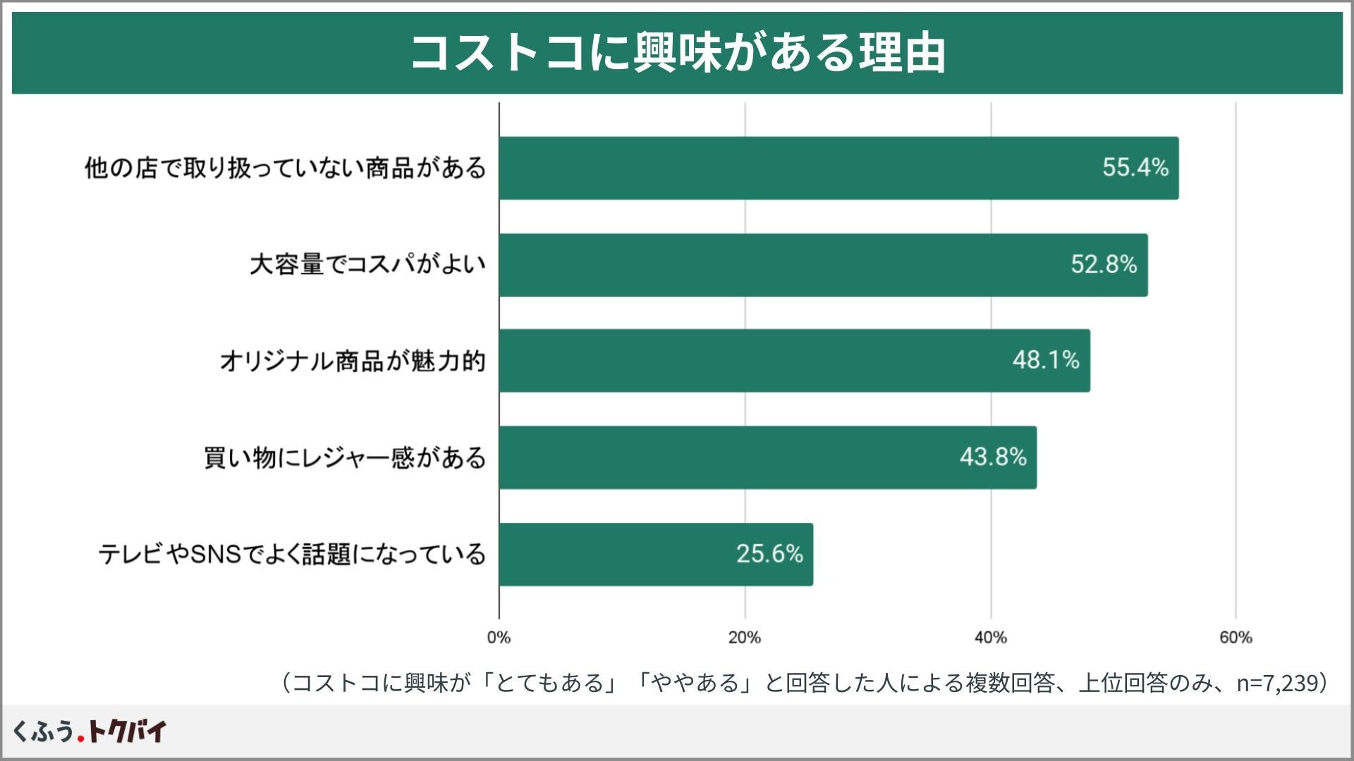 「コストコに興味がある」と回答した人は70.7%(「とても興味ある」34.3%、「やや興味ある」36.4%の合計)。興味がある理由として、「他の店で取り扱っていない商品がある」(55.4%)、「大容量でコスパがよい」(52.8%)、「オリジナル商品が魅力的」(48.1%)が上位に挙がりました。コストパフォーマンスや独自性など、販売商品に魅力を感じている人が多いことがわかります。
