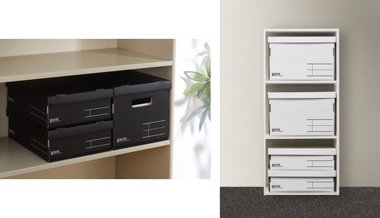 「収納ボックス<NEOS>」は、「既存のオフィス用のサイズではちょっと大きすぎる!」という声に応え、家庭での収納に適したサイズを追加します。既存品よりもひとまわり小さく、紙など重みのあるもののストックに向いているレギュラーサイズと、レギュラーサイズの高さを半分にした、文具や子どもの作品、記念のチケットなど細々したものを収容することに向いているレギュラーハーフサイズの2サイズです。どちらも、市販のカラーボックスや家庭の棚内、棚上にも収まるサイズで効率的に保管できます。