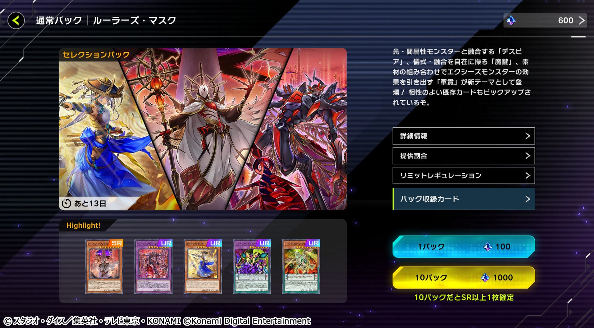 セレクションパック「ルーラーズ・マスク」では、「妖眼の相剣師」や「デスピアン・クエリティス」、 「スターヴ・ヴェネミー・リーサルドーズ・ドラゴン」など、UR・SRカード15種を含む新規カード40種などがランダムに封入されています。