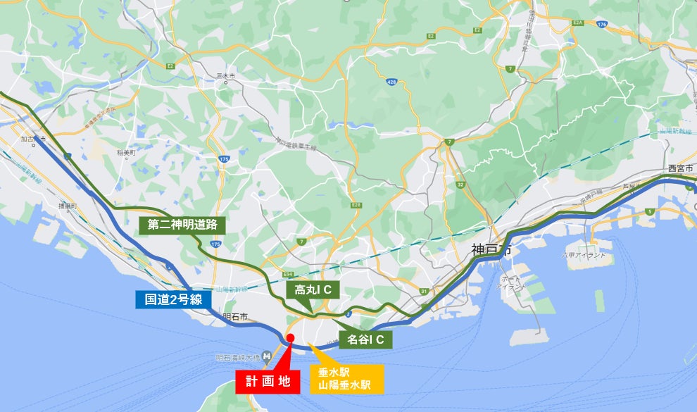 JR神戸線および山陽電鉄本線が交わる「垂水」駅、「山陽垂水」駅から徒歩圏内。国道2号からのアクセスも良好。