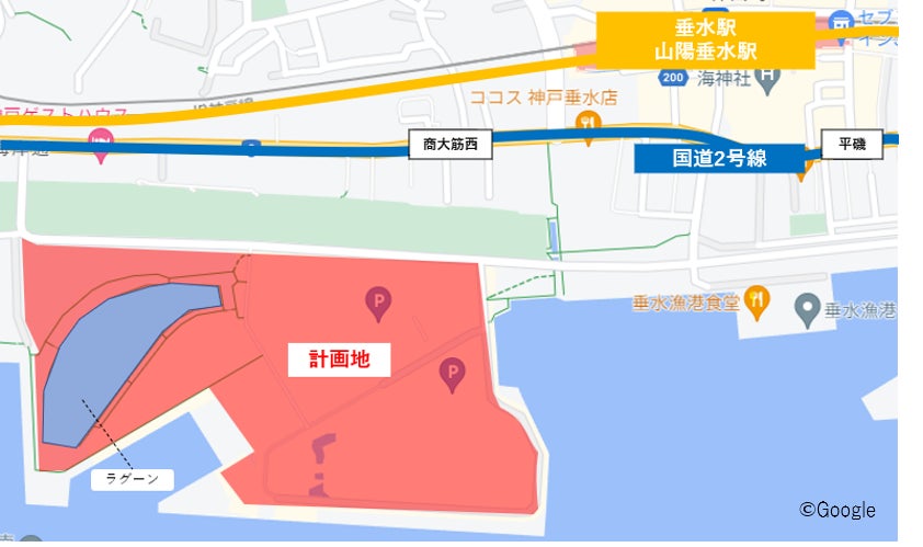 本計画地は、JR神戸線および山陽電鉄本線が交わる「垂水駅」「山陽垂水駅」から徒歩圏内であり、国道2号や第二神明道路「高丸IC」「名谷IC」からも至近の交通利便性が高い施設です。1999年10月の開業以来、多くのお客さまにご愛顧いただいてまいりました「三井アウトレットパーク マリンピア神戸」(開業当時の施設名:マリンピア神戸ポルトバザール)を一時閉館し、新たに事業地として拡張したラグーン(海水を引き込んだ池)周辺の敷地を含む施設の一体的な建替え工事を行なうものです。