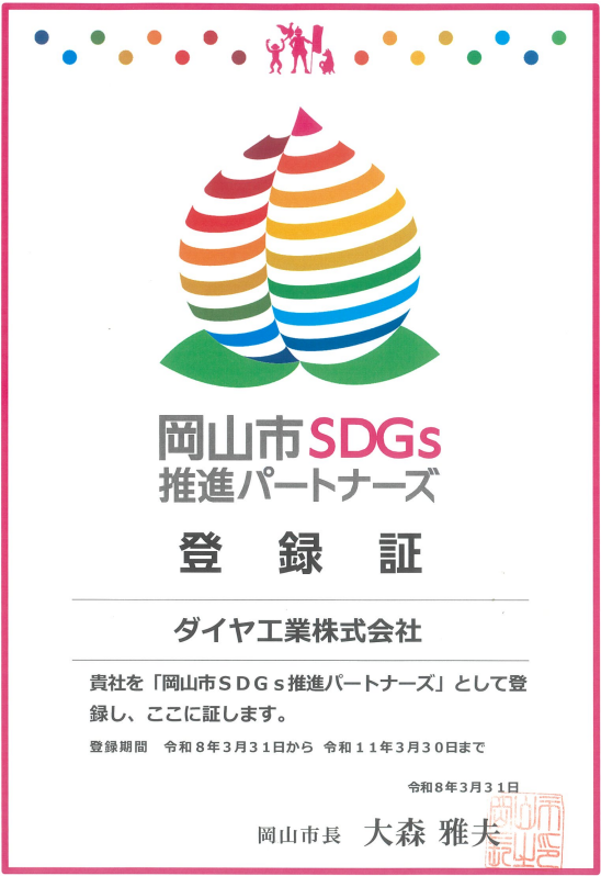医療用品メーカーのダイヤ工業株式会社(本社:岡山県岡山市 代表取締役:松尾浩紀)は、岡山市が推進する「岡山市SDGs推進パートナーズ」について、登録の更新が完了したことをお知らせいたします。