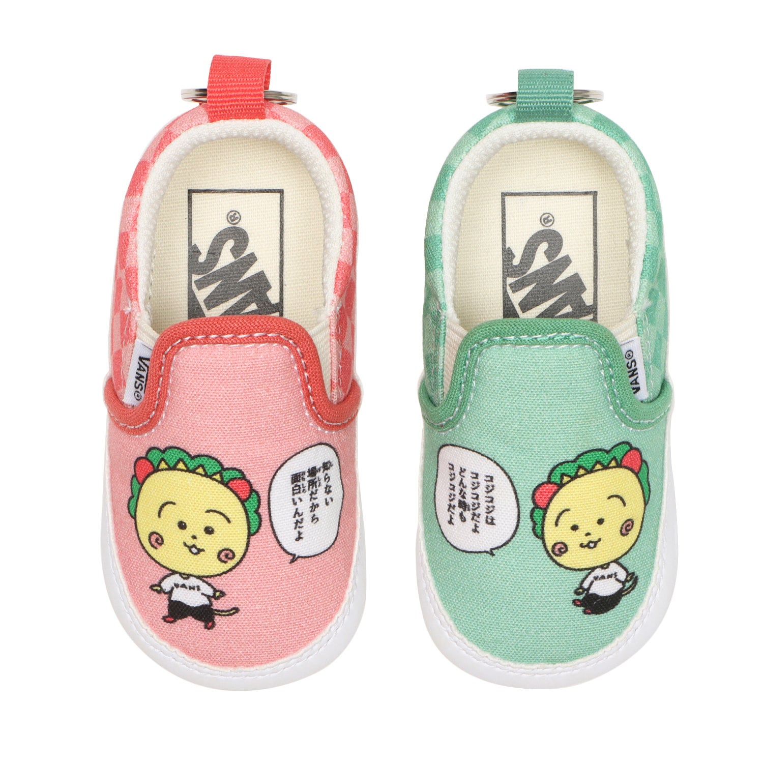 チェッカー柄の中からコジコジが顔を覗かせ、よく⾒るとおたんこなすも紛れたユニークなスリッポン。こちらにもミッドソールにコジコジロゴをプリント。