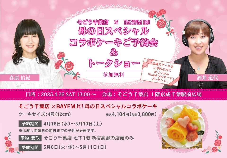 ケーキの販売に伴い、4月26日 土曜日 午後1時から、そごう千葉店 1階京成千葉駅前広場にて、「BAYFM it!!」DJの春原佑紀と、「LET’S SO-GO」レポーターの酒井道代によるトークショーを開催します。イベント終了後、会場でケーキをご予約された皆様に、オリジナル「thank you カード」をプレゼントします。