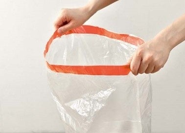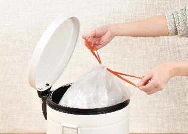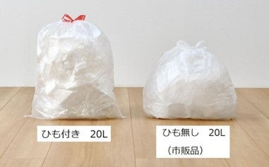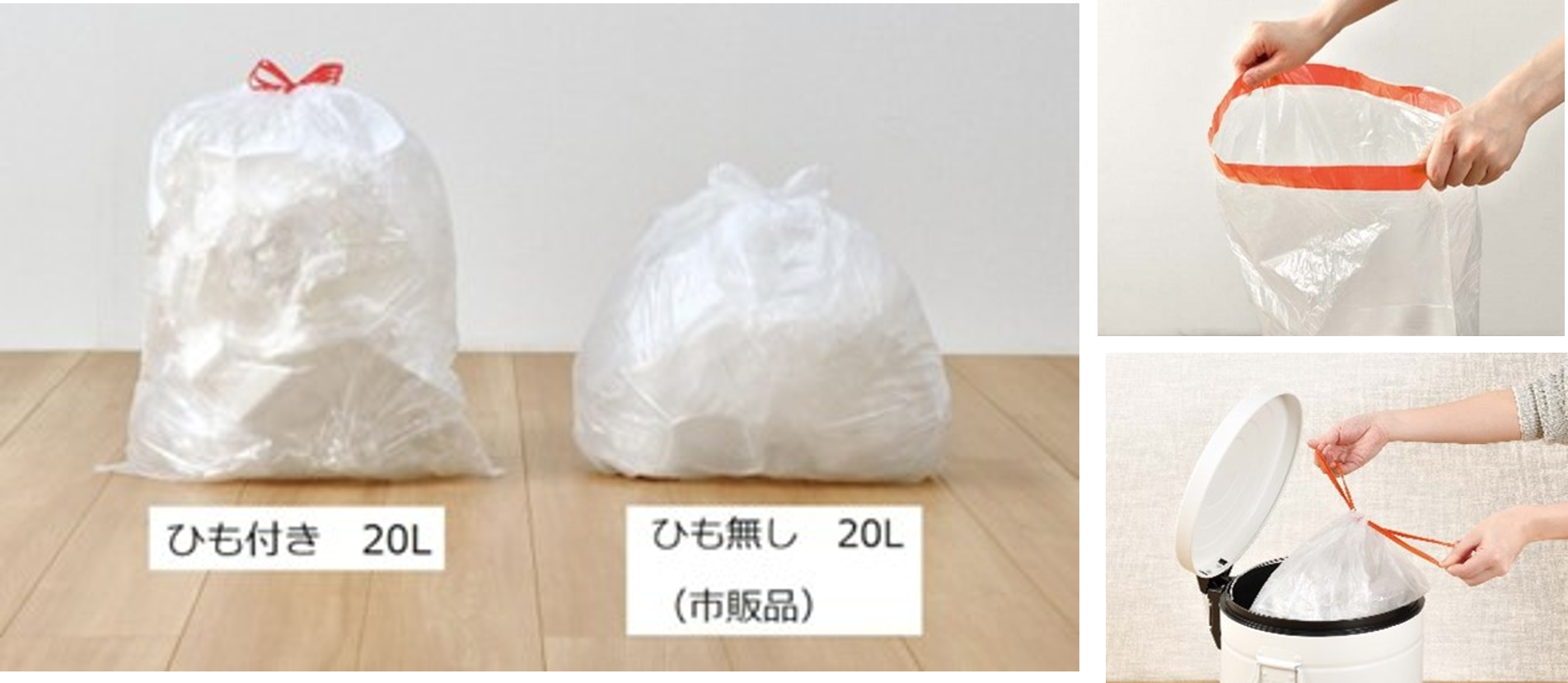 本製品はふちに結ぶためのひもがついているので、ひもを引くだけで簡単に結ぶことができます。同量のポリ袋(ひも無しタイプ)と比較しても多くごみを入れることができ、結ぶ際に中身がもれにくいので衛生的です。