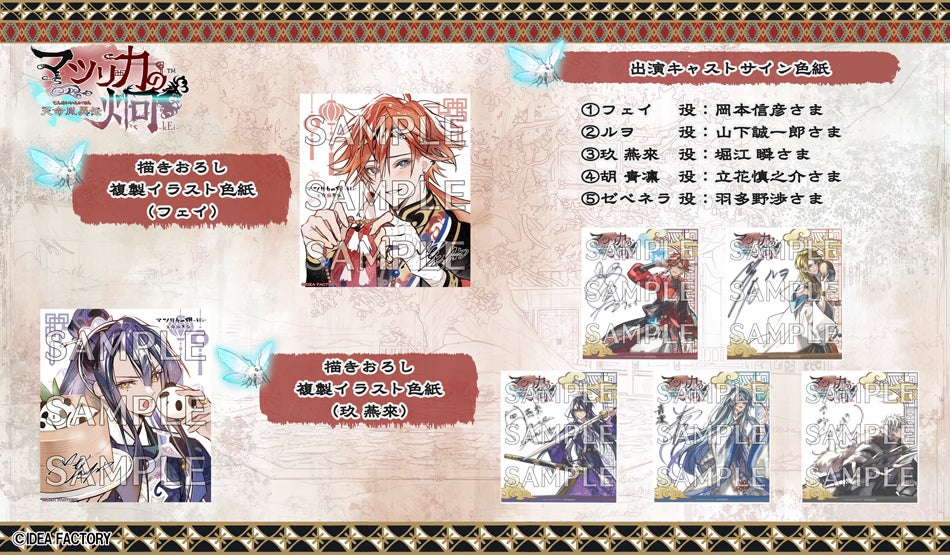 アイディアファクトリー株式会社(代表取締役社長:佐藤 嘉晃/所在地:東京都豊島区)の女性向けゲームブランド「オトメイト」は、Nintendo Switch™用ゲームソフト「マツリカの炯-kEi- 天命胤異伝」を対象店舗でお買い上げの方の中から抽選で蓮本リョウ氏描きおろしのイラスト色紙や出演キャスト様のサイン色紙をプレゼントするキャンペーンを発表いたしました。