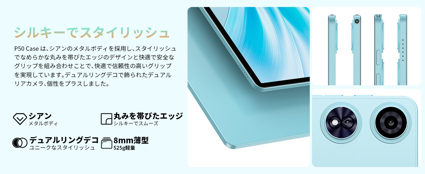 P50 Caseは、シアンのメタルボディを採用し、スタイリッシュでなめらかな丸みを帯びたエッジのデザインと快適で安全なグリップを組み合わせことで、快適で信頼性の高いグリップを実現しています。デュアルリングデコで飾られたデュアルリアカメラ、個性をプラスしました。