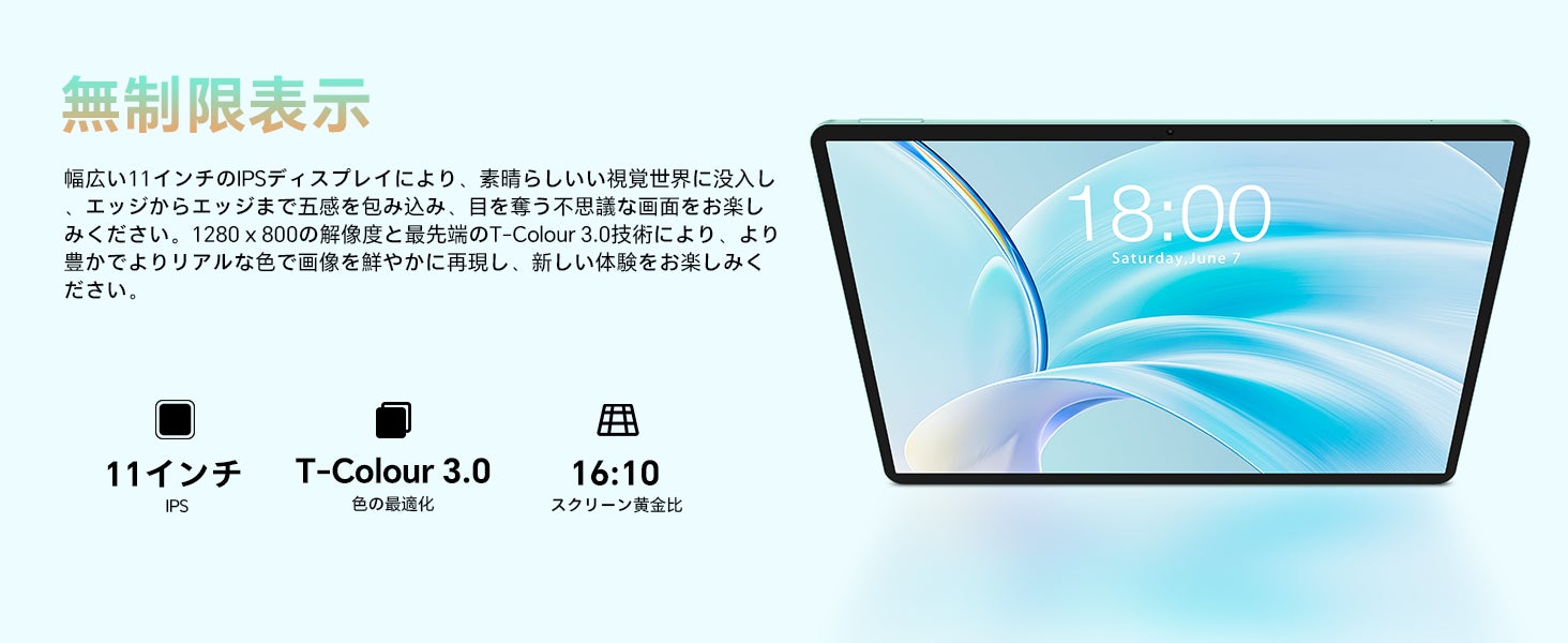 幅広い11インチのIPSディスプレイにより、素晴らしい視覚世界に没入し、エッジからエッジまで五感を包み込み、目を奪う不思議な画面をお楽しみください。1280×800の解像度と最先端のT-Colour 3.0技術により、より豊かでよりリアルな色で画像を鮮やかに再現し、新しい体験をお楽しみください。