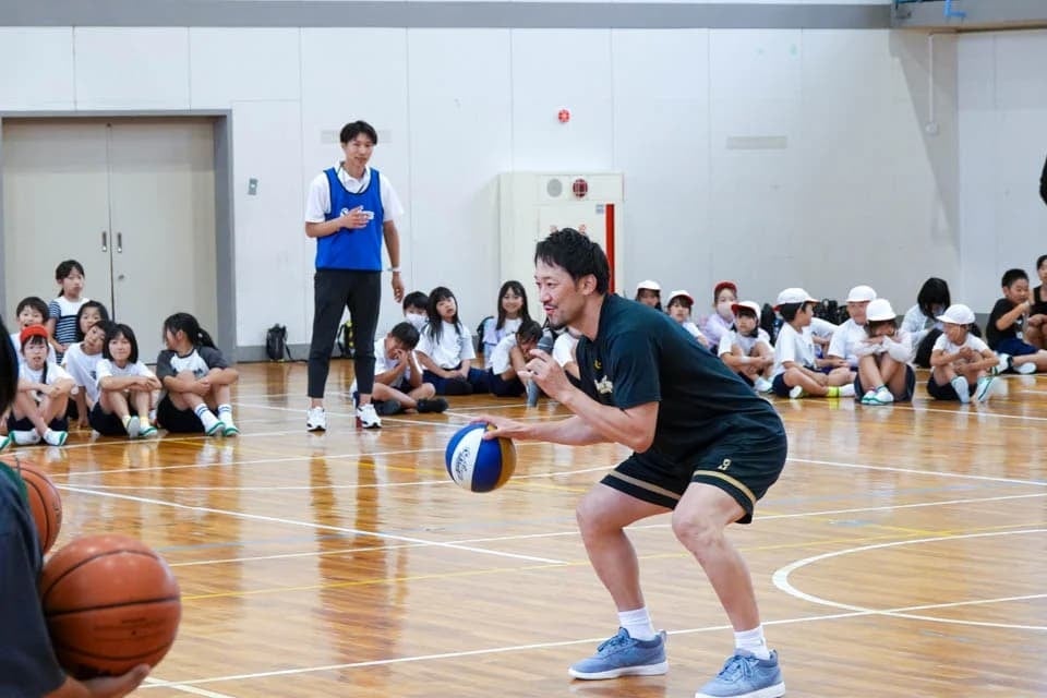 多くの質問をいただいた後は、体育の授業に参加してバスケットボールを行い、児童たちのリクエストに応え柏木選手がダンクシュートを決めるなど、充実した時間を過ごすことができました。