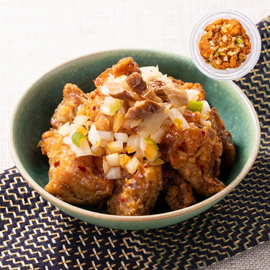 鶏唐揚げに、秋田の郷土料理であるいぶりがっこに食べるラー油を和え、玉ねぎをトッピングしました。