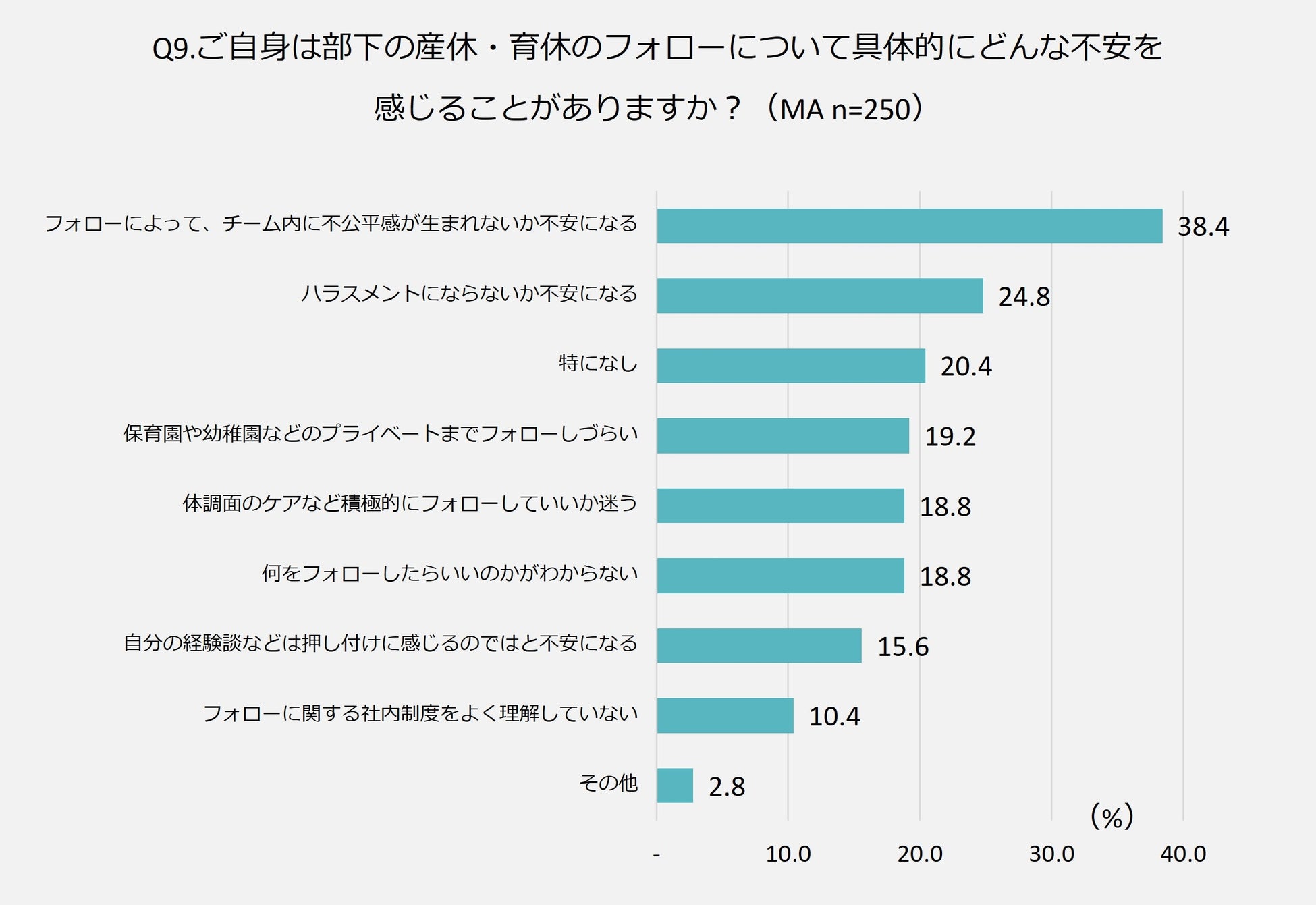 また、「Q8:ご自身は部下の産休・育休のフォローについて不安を感じたことはありますか?」という問いには、48.8%が「ある」と回答しました。具体的な不安要素として、「フォローによって、チーム内に不公平感が生まれないか不安になる(38.4%)」が最も多い結果となりました。(Q9)