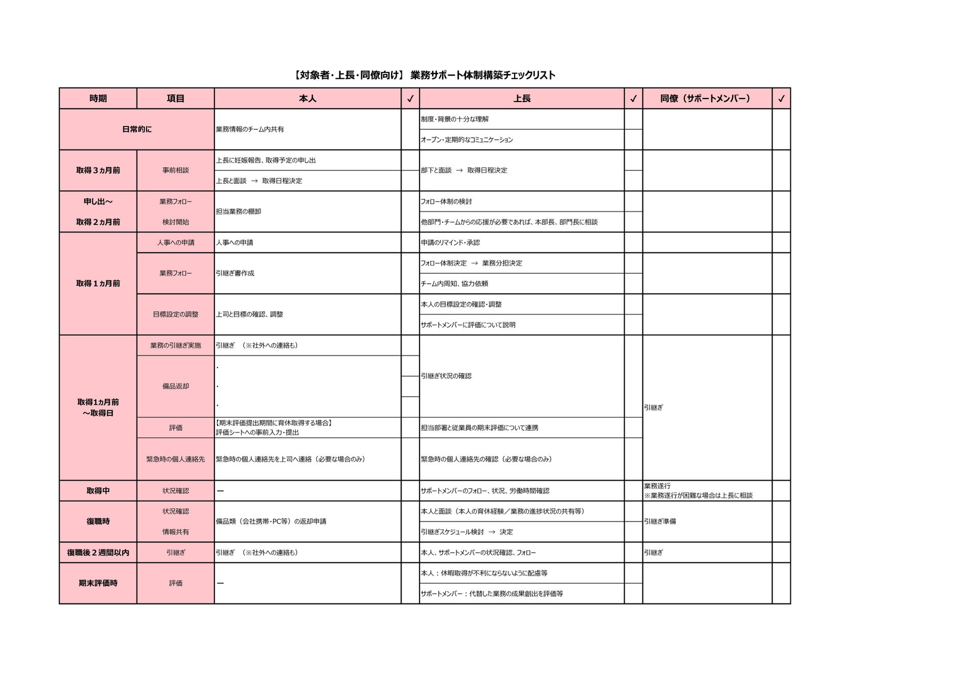 産休・育休取得前後に、取得者本人・上司・同僚それぞれの立場で、時系列に沿ったタスクを確認できるチェックリストです。当社の社員の声を元に、どの職種でも共通する内容を抽出して作成しています。