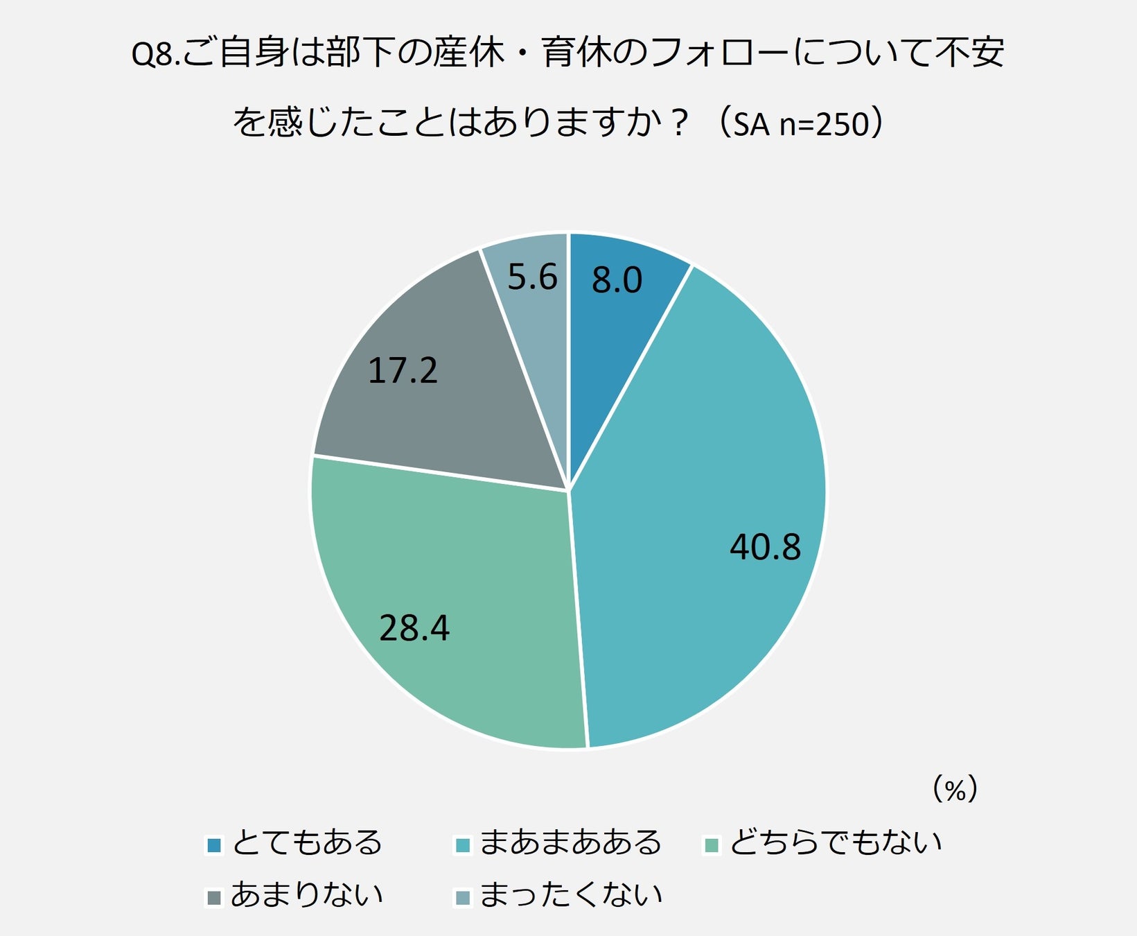 「Q7:ご自身は部下の産休・育休の不安に関して十分にフォローできていると感じますか?」という問いでは、45.6%が「とてもそう思う」・「そう思う」と回答しました。