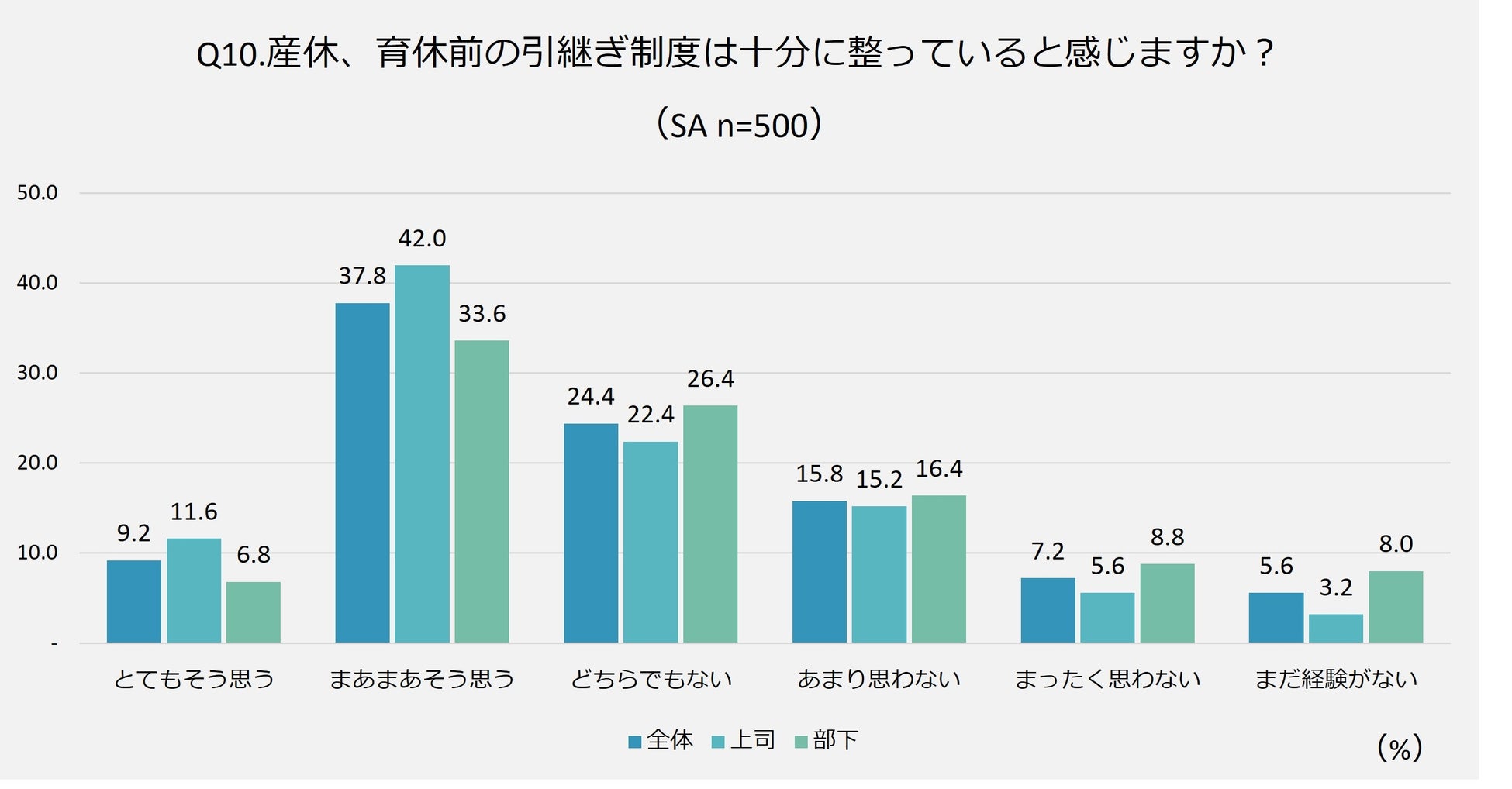 「Q10:産休、育休前の引継ぎ制度は十分に整っていると感じますか?」という質問では、上司は「とてもそう思う」・「そう思う」が53.6%に対し、育休対象者は「とてもそう思う」・「そう思う」が40.4%と13ポイントの差があることがわかりました。
