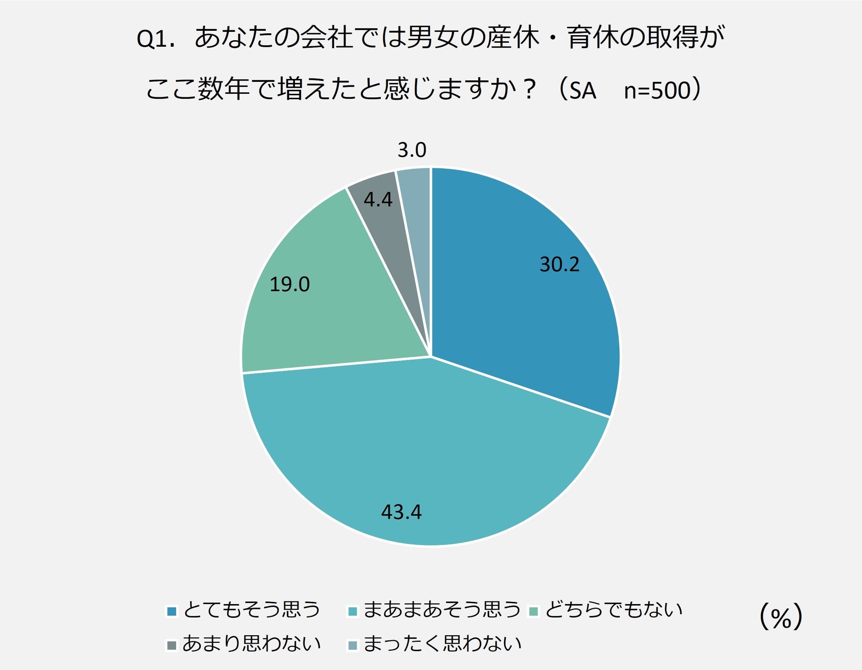 Q1:あなたの会社では男女の産休・育休の取得がここ数年で増えたと感じますか?」という質問では、全体の73.6%が「とてもそう思う」・「そう思う」と回答しました。