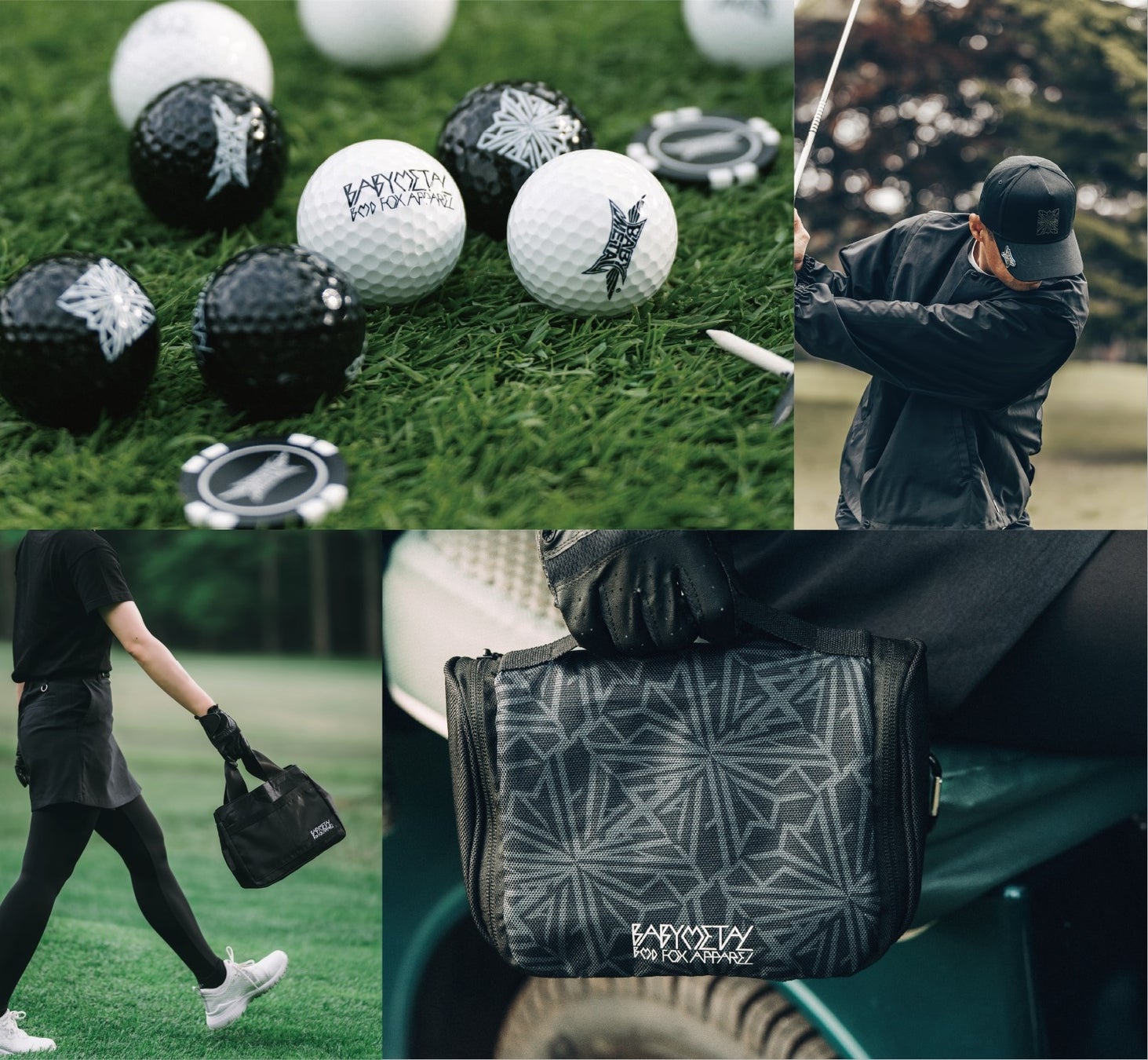 ゴルフボールセットはBMD FOX APPARELやBABYMETALのロゴを施したゴルフボール(BLACK×2個/WHITE×2個)とマーカーのスペシャルセット。ボールやティーなどラウンド中の必需品を収納できるポーチはカートやキャディバッグにも付けられる機能性の高い仕様に仕上がりました。キャップはさりげないラバーロゴが目を惹くシックなデザインに。キャップのツバ先にはマグネットが内蔵され、付属のプレートマーカーを装着できます。ミニトートはBMD FOX APPARELの刺繍ロゴが両面に施され、収納も多数で使いやすいデザインに仕上がりました。