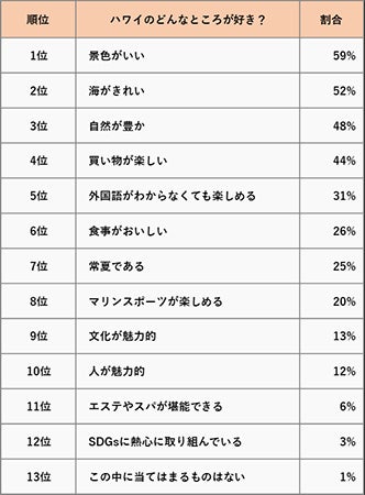1位は「景色がいい」(59%)となりました。美しいビーチはもちろん、雄大な山々がそびえ、ヤシの木やハイビスカスなど南国ならではの植物が生える景色は、ハワイの大きな魅力です。続く2位「海がきれい」(52%)、3位「自然が豊か」(48%)も、自然の景観が関係する項目となりました。