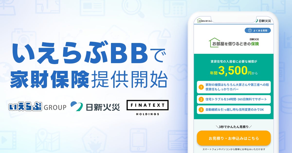 株式会社いえらぶGROUP(本社:東京都新宿区、代表取締役:岩名 泰介、以下「いえらぶGROUP」)、日新火災海上保険株式会社(本社:東京都千代田区、取締役社長:織山 晋、以下「日新火災」)、株式会社Finatext(本社:東京都千代田区、代表取締役CEO:木下 あかね、以下「Finatext」)は、不動産業者間流通プラットフォーム上で家財保険に申込み・加入できる仕組みを共同開発しました。不動産のリーシング業務をワンストップでオンライン化する業者間流通プラットフォーム「いえらぶBB」内で、インターネット完結型の賃貸入居者向け家財保険「お部屋を借りるときの保険」の提供を開始します。