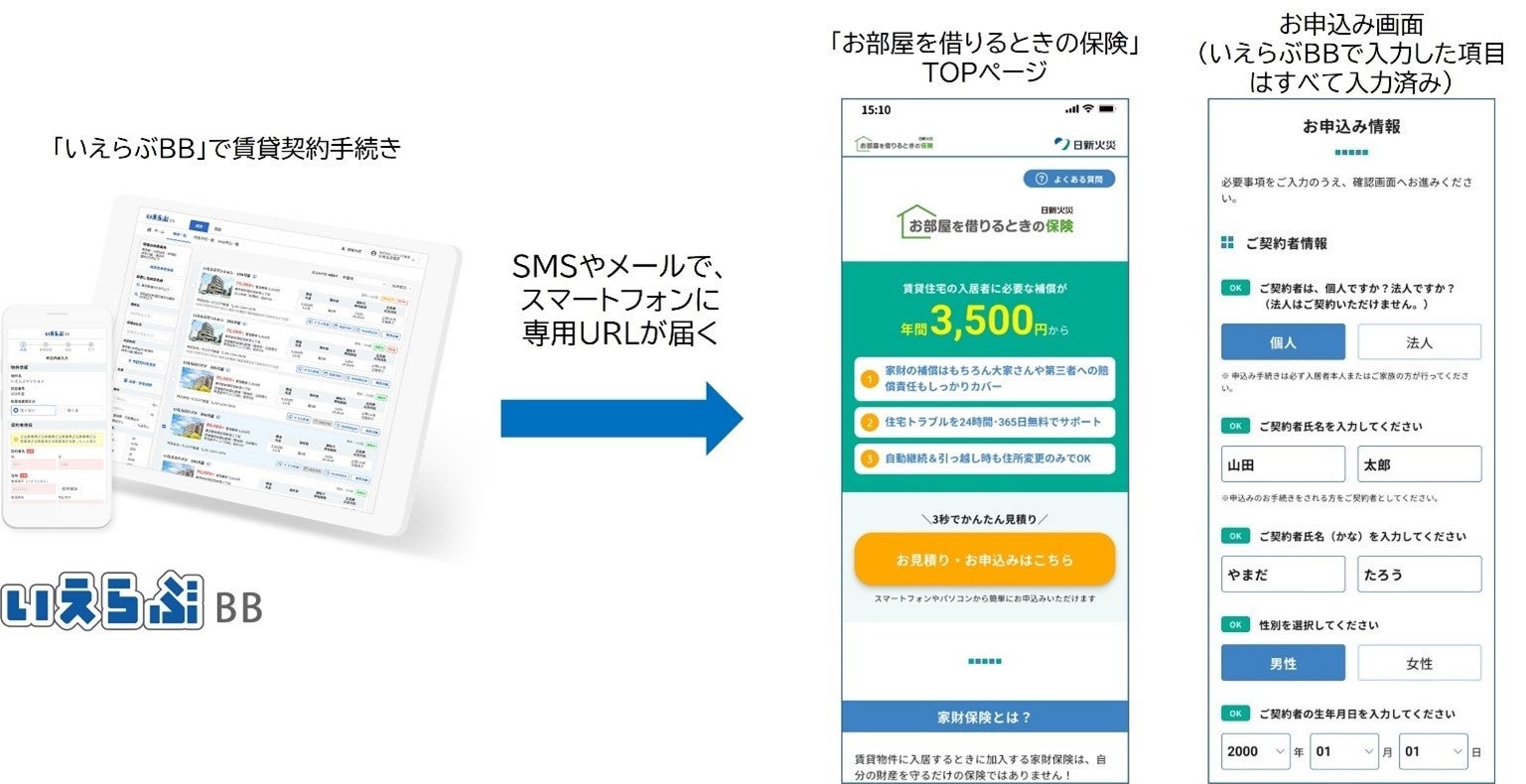 今回、いえらぶGROUPが運営する「いえらぶBB」と、Finatextの「Inspire」をAPI連携し、「Inspire」に日新火災が提供する賃貸入居者向け家財保険「お部屋を借りるときの保険」を搭載しています。これにより、「いえらぶBB」に登録されている物件情報や入居者の情報が、日新火災の申込みシステムに反映された状態で家財保険のご案内メールが送付されるため、入居者は必要最小限の情報入力のみでスムーズに家財保険を申込むことができます。また、「お部屋を借りるときの保険」は契約が1年ごとに自動更新されるため、更新手続きも不要です。