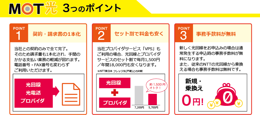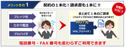 NTT東日本もしくはNTT西日本とプロバイダで別々だった請求書が、MOT光では弊社との契約のみで全て完了。請求書も一本化され、手間がかかる支払い業務の負担を軽減することができます。