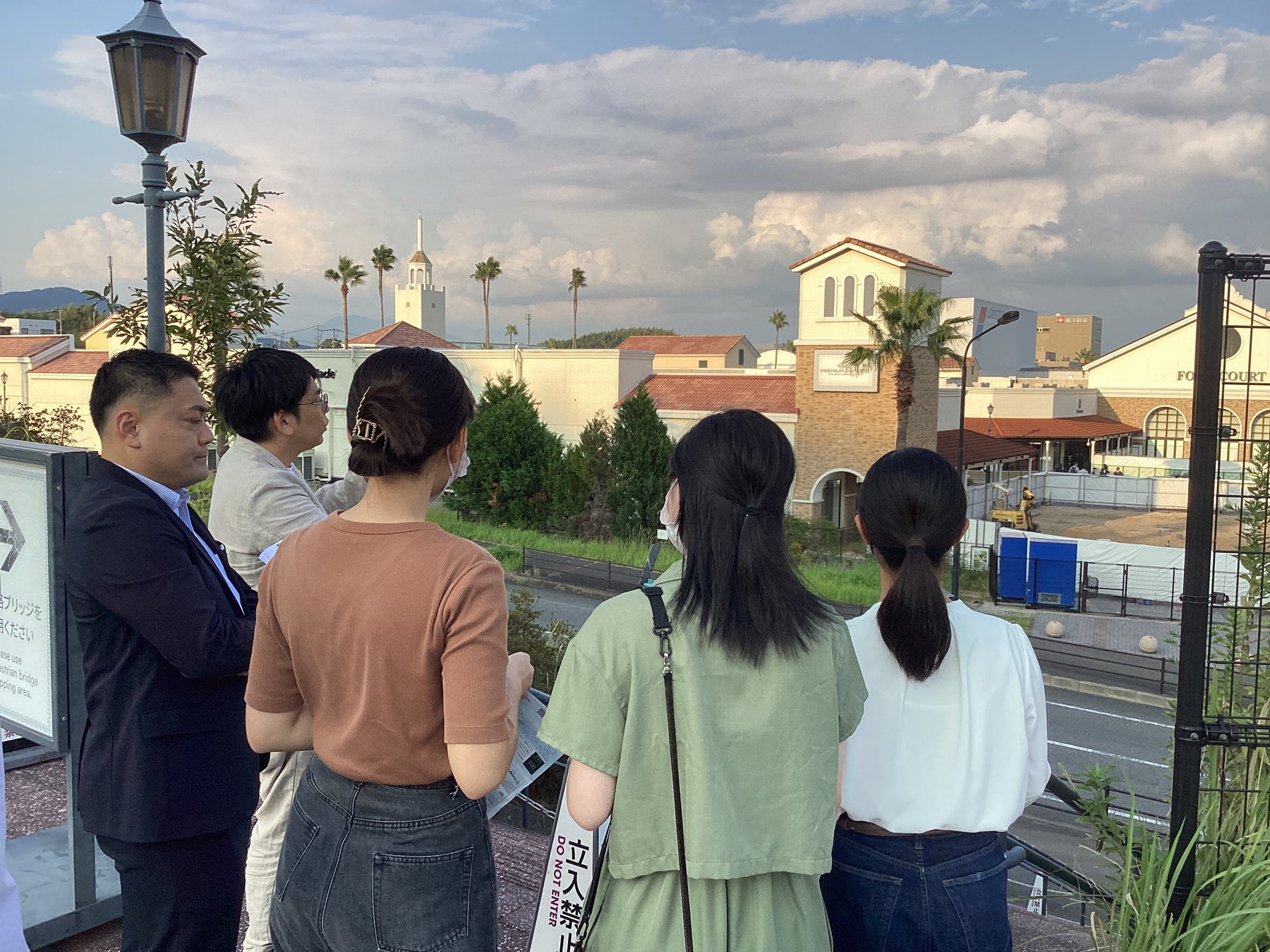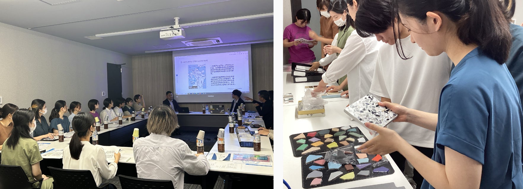 アウトレット施設の施設概要や地域との取り組み、今回のデザイン提案におけるテーマなどの説明が行われたのち、学生たちはプランターに使用する素材タイルのサンプルを実際に手に取り、各々創作イメージを膨らませました。また、鳥栖プレミアム・アウトレット社員による場内ツアーが行われ、施設デザインやアウトレットの成り立ちについてなど、飛び交う学生たちの質問に社員が答えながら交流と知見を深めました。