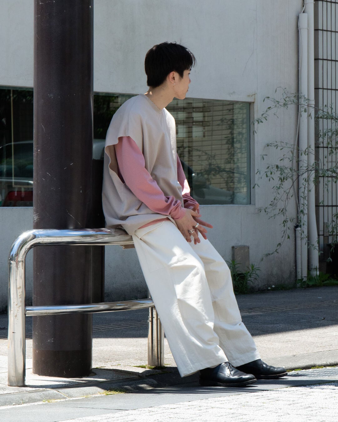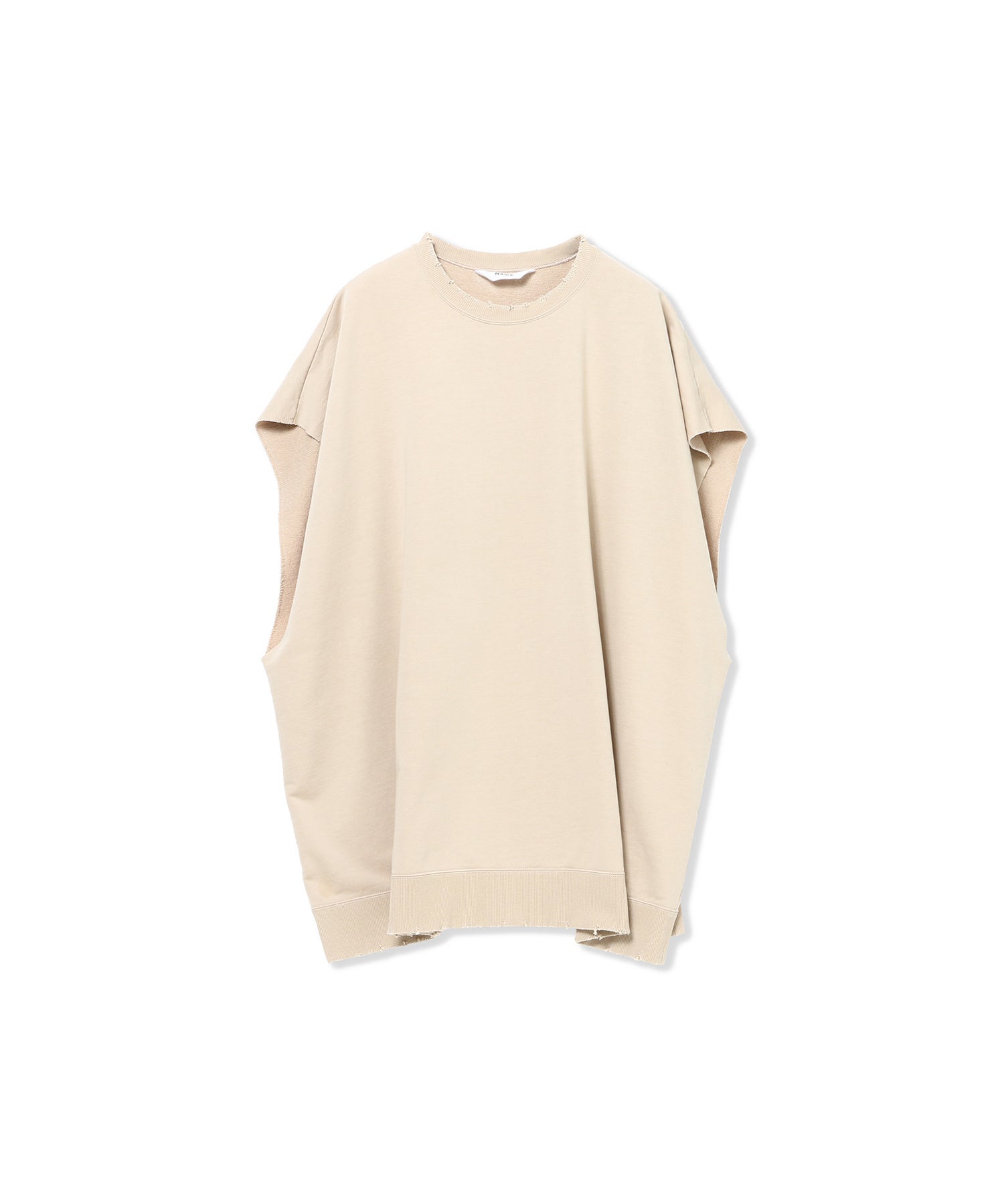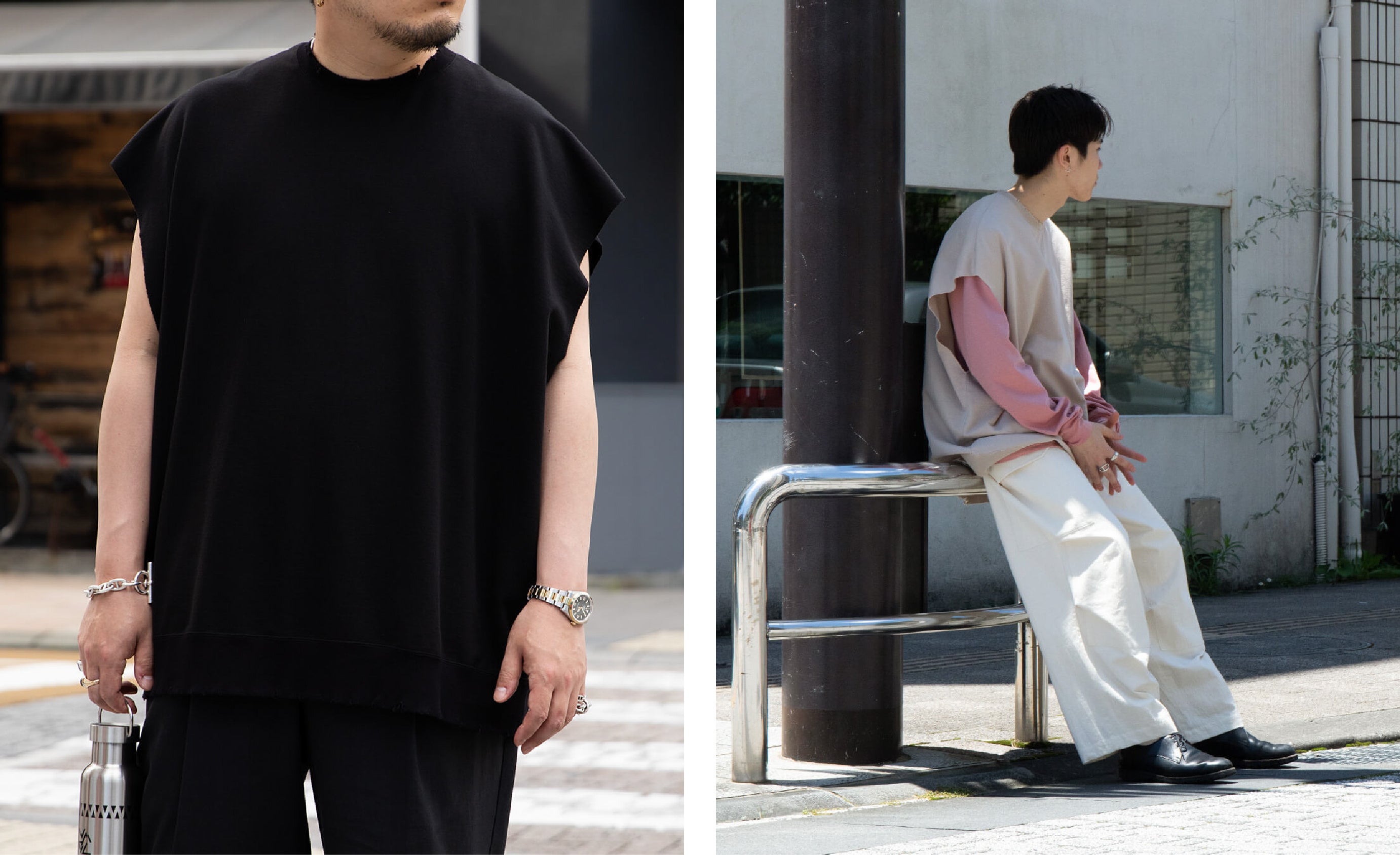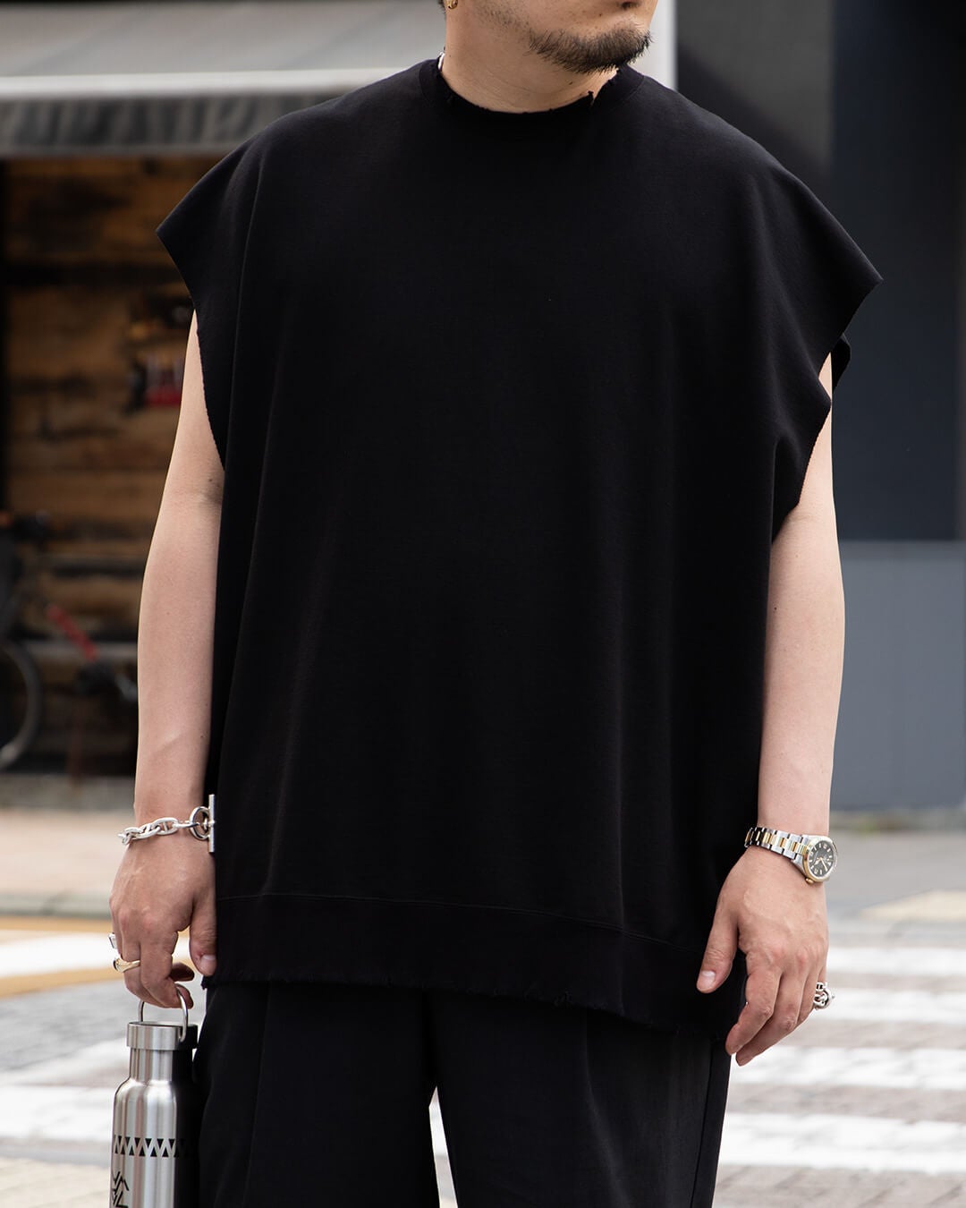 昨年に続く「FIGURE」別注アイテムは、前回好評を博したノースリーブデザインとなり、上質なスウェット素材に手作業でダメージ加工を加え、程よいゆるさのあるシルエットが特徴です。1枚でもレイヤードでも様々なスタイリングを楽しめる1着に仕上がっています。