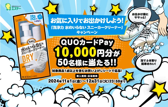 エステー株式会社は、抽選で50名様に“QUOカードPay 10,000円分”をプレゼントする『お気に入りでお出かけしよう!「洗浄力 水のいらない スニーカークリーナー」キャンペーン』を実施します。
