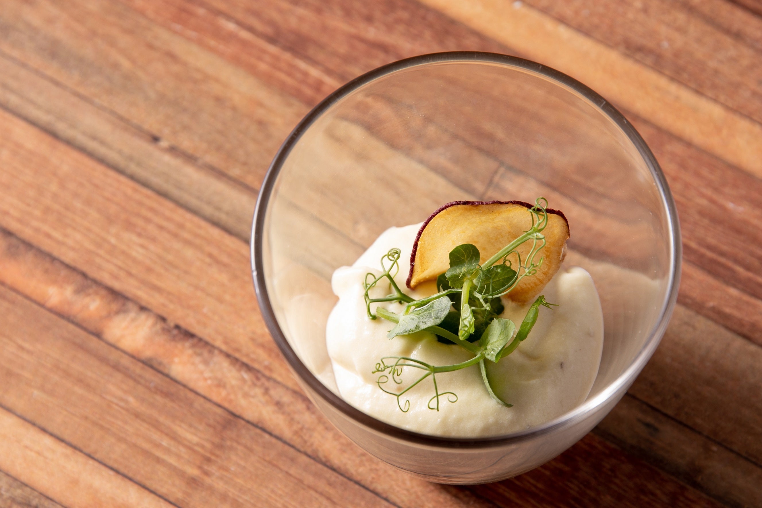 アミューズの1品目には、脂がのった戻り鰹をさっと炙り、葉山夏蜜柑ポン酢のエスプーマ(泡)でさっぱりとした味に。2品目には、三浦の大地で育った甘みのあるサツマイモをムースにし、葉山・日の出園のほうじ茶ジュレとクランブルでアクセントを加えました。