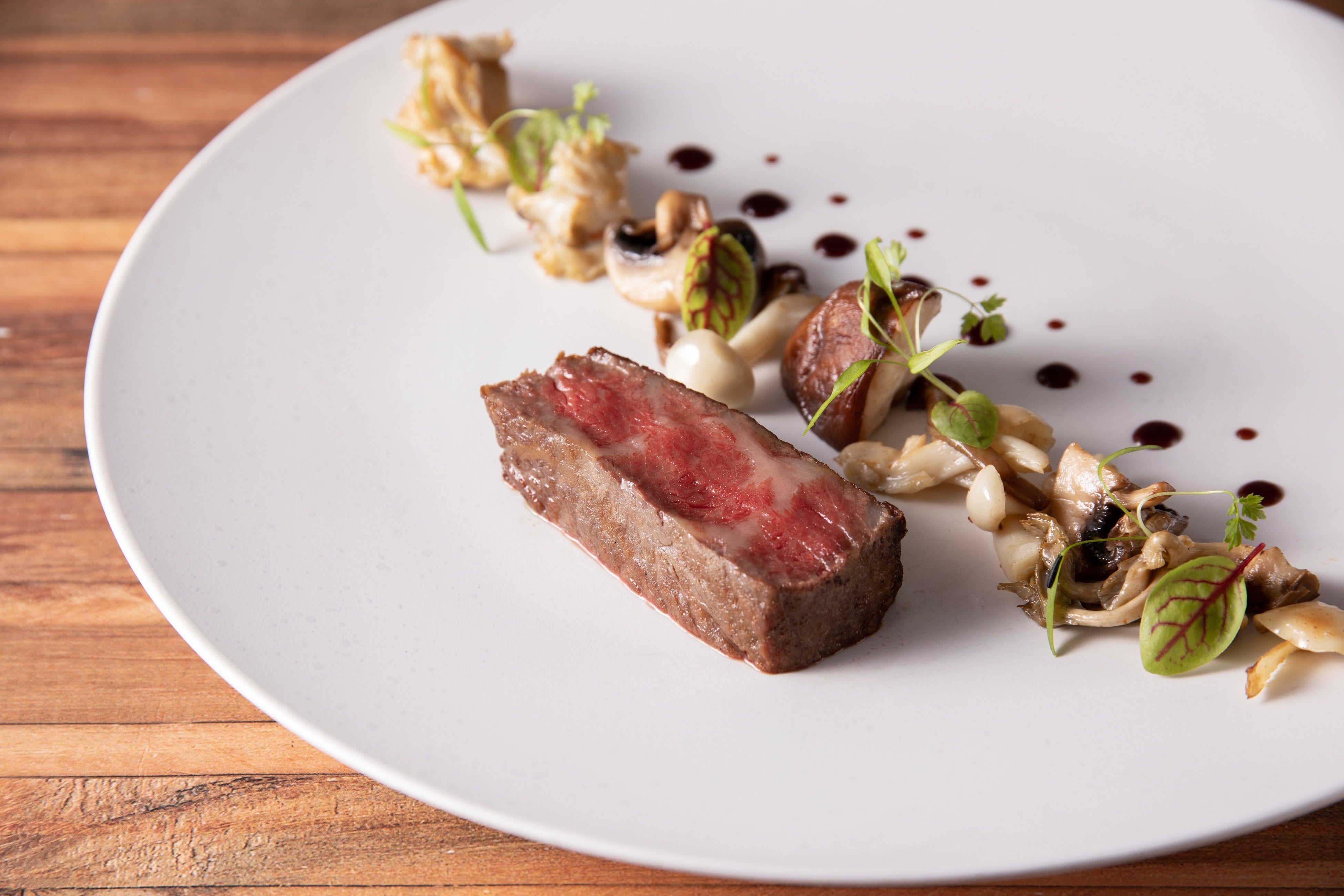 神奈川県のブランド牛やまゆりは、風味が豊かで柔らかく、脂質も上質な味わいがあると人気を集めています。メイン料理は、やまゆりのサーロイン部分を低温でじっくりと焼き上げました。旬のキノコと、国産品種マスカットベリーAで作られた赤ワインソースでご賞味ください。