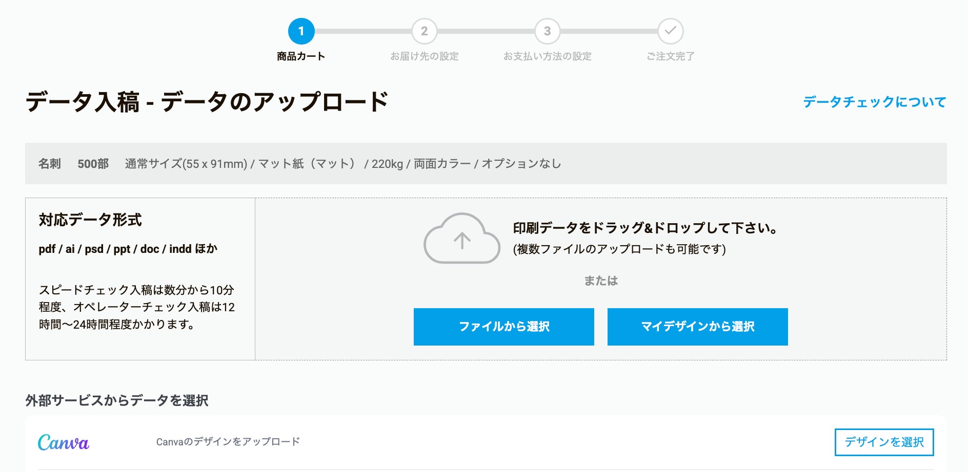 ラクスルで用紙や価格を比較しながらニーズに合うオプションを選択し、完成したデザインを入稿します。入稿が完了したら注文完了です。