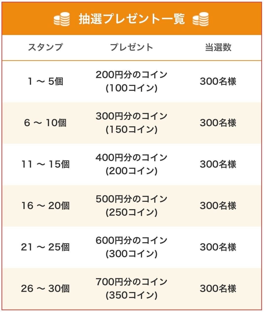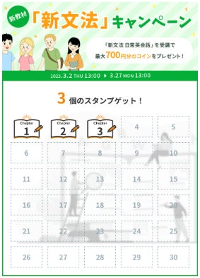 期間中、新教材「新文法 日常英会話」でレッスンを受講すると、スタンプを獲得できます。スタンプラリーの獲得スタンプ数に応じて、抽選で最大700円分のコイン(350コイン)をプレゼントいたします!