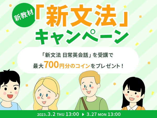 ネイティブスピーカーと回数無制限のオンライン英会話サービス「ネイティブキャンプ英会話」を展開する株式会社ネイティブキャンプ(東京都渋谷区 代表取締役:谷川国洋)は、楽しく英語を学べるオリジナル教材「新文法 日常英会話」のリリースを記念してキャンペーンを開催いたします。