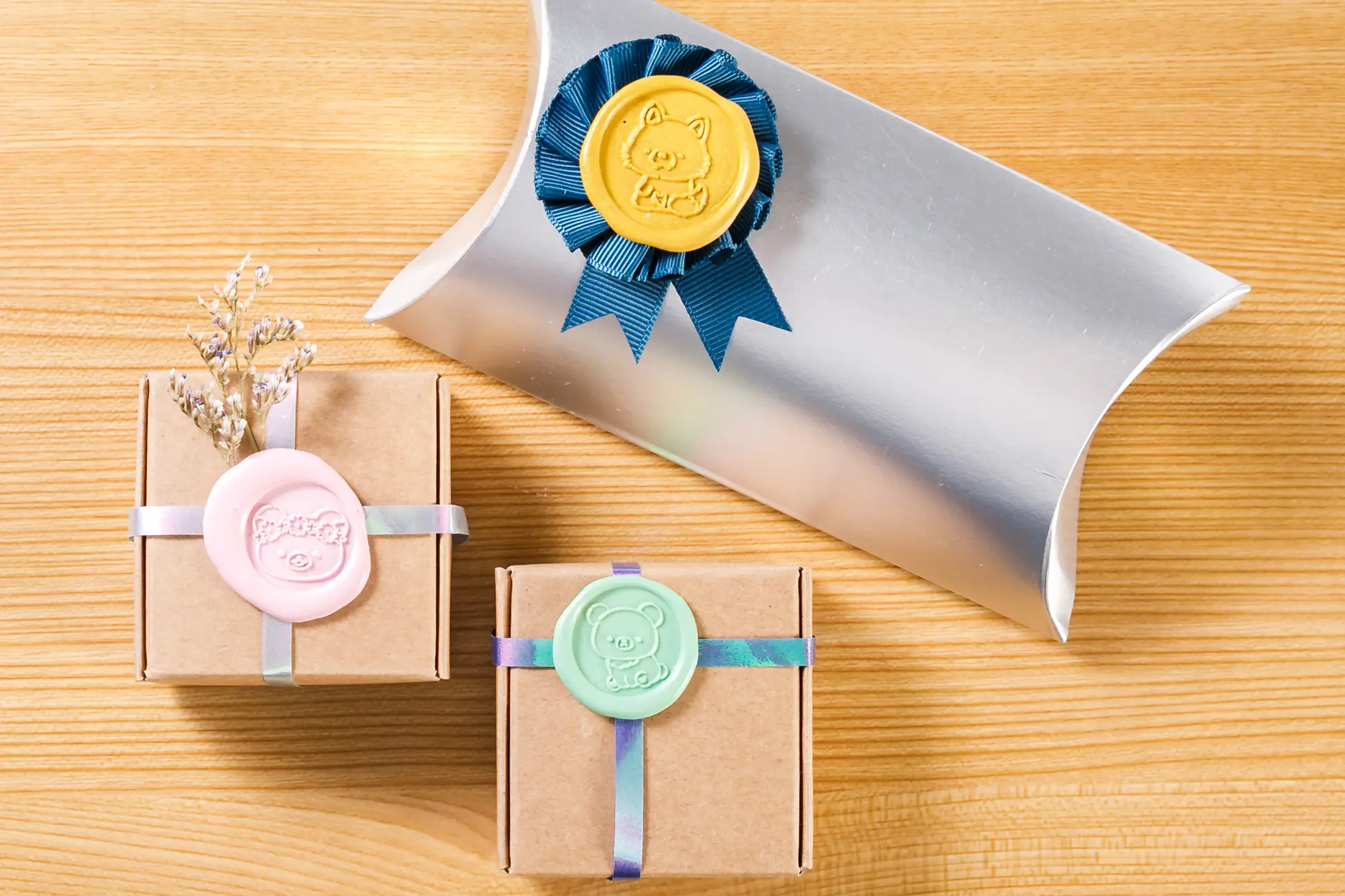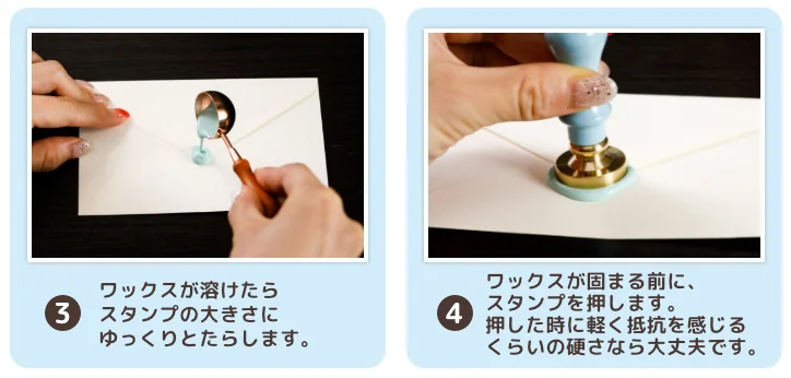 セットには、直径20ミリか25ミリが選べるシーリングスタンプの印面、パステルカラーの8色から選べるかわいいハンドルが各1個。さらに14色から選べるワックスが50粒、ワックスを熱するためのスプーンが付属します。