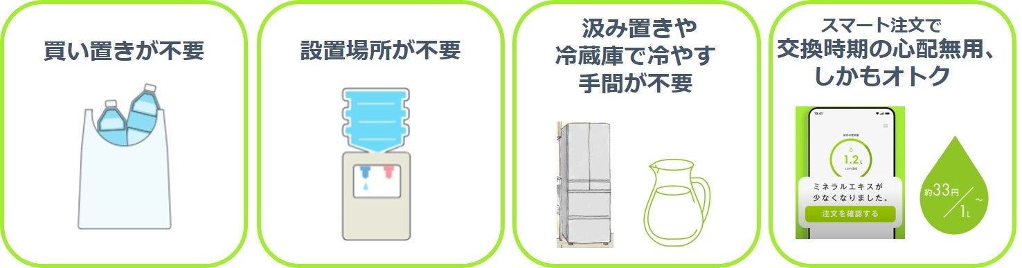 時間を効率的に使うタイムパフォーマンス(タイパ)や限られたスペースを有効活用するスペースパフォーマンス(スぺパ)を重視する人が増えています。家庭の水道からミネラル in ウォーターを提供することで、買い出しの手間やスペース確保、冷蔵庫での冷やす作業などさまざまな手間から解放され、家事ラクを実現します。さらに、専用アプリでGreentapをインターネットに接続することで、ミネラルボトルの残量を検知し、自動で交換セットを注文できるプランもあるため、交換時期の心配もいりません。