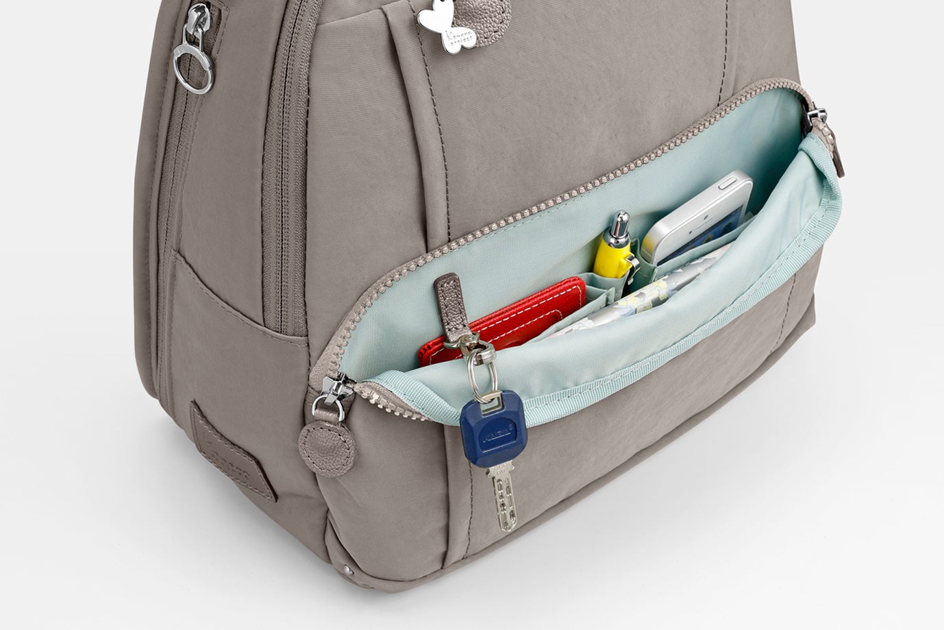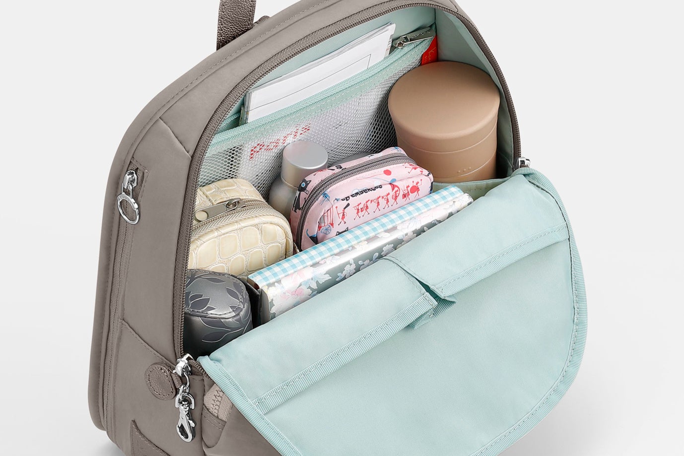 リュック上部はスリムに、下部はしっかりマチ幅を設けることで、見た目の印象以上にたくさんの荷物を収納できます。内装には中身が透けて見えるメッシュポケットなどの多彩なポケットを配置しました。薄暗い場所でも中が見やすいよう、明るいミントグリーンの内装生地を使用しています。