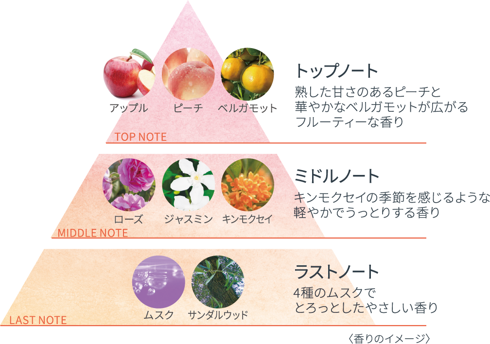 ピーチのアクセントとウッディパートを強め、いつものさんぽみちから香るような季節感を感じる軽やかな金木犀の香りをイメージしました。