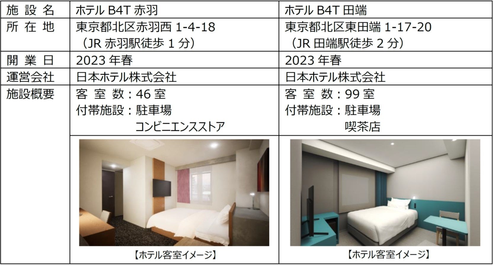 さまざま施設規模や立地条件に対応するホテル運営のプロトタイプとして、「ホテルB4T赤羽」および「ホテルB4T田端」を2023年春に開業します。