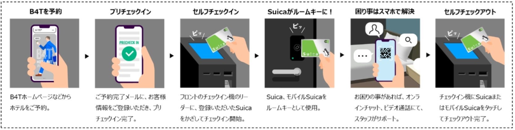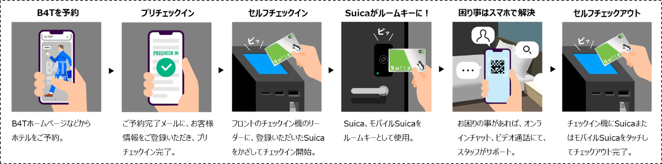 予約からチェックイン、チェックアウトまでの手続きが、お手持ちのSuicaとスマートフォンで完結します。滞在中のお困り事は、スマートフォンよりオンラインチャット、ビデオ通話にてスタッフがサポートします。