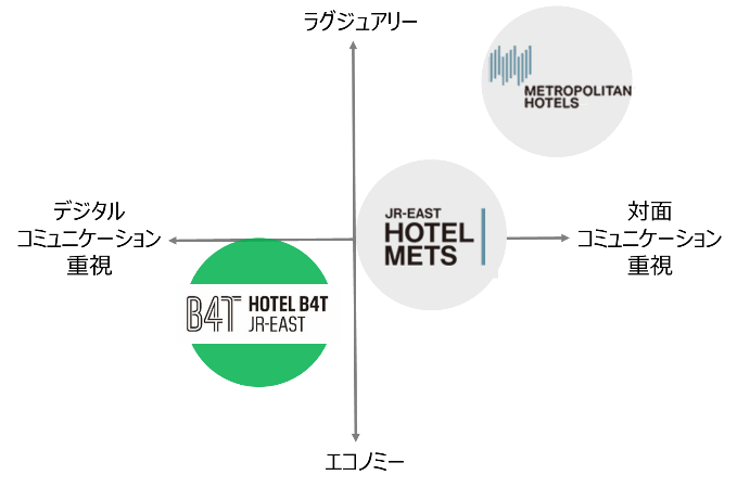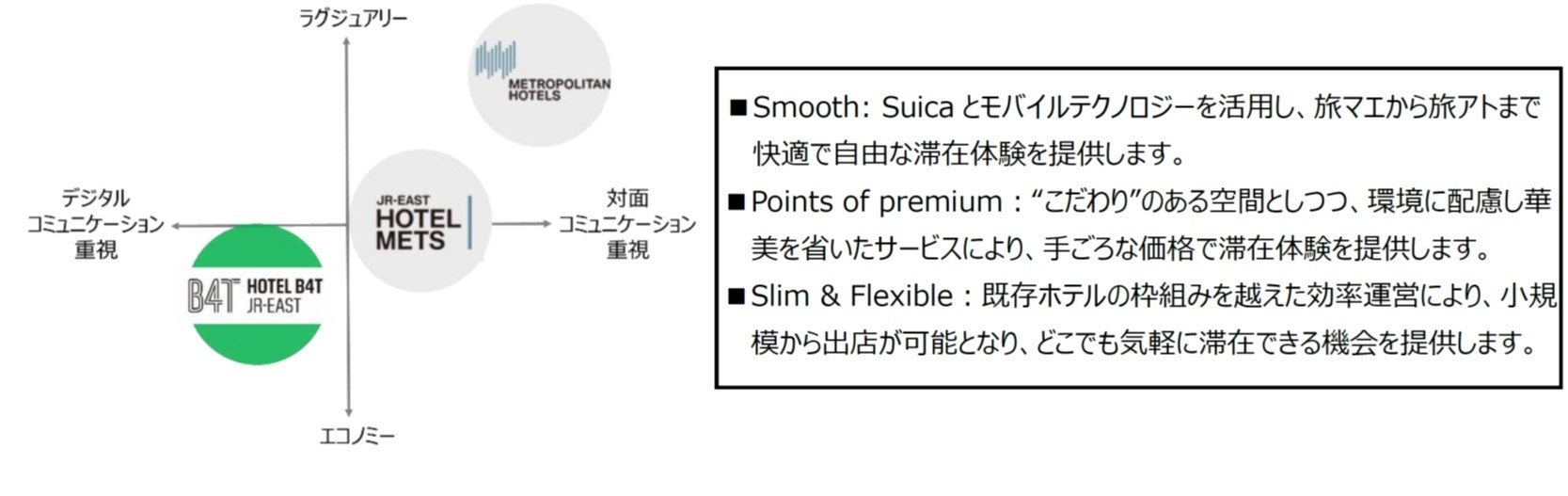 「ホテルB4T」は、スタッフによるおもてなしを重視するメトロポリタンホテルズ・JR東日本ホテルメッツとはサービスの手法を変えて、手軽でスピーディーなデジタルコミュニケーションを求めるお客さまに対し、抑揚ある滞在体験を手ごろな価格で提供します。
