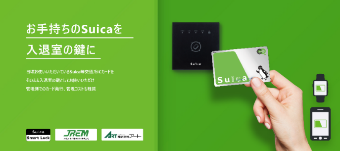 JR東日本メカトロニクス株式会社と、株式会社アートが共同で運営する「Suicaスマートロック」は、お手持ちのSuicaが入退室の鍵として利用できるサービスです。JR東日本グループなどのオフィスや商業施設などで導入実績がありますが、ホテルの客室キーとしてご利用いただけるのは、日本初となります。