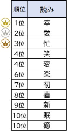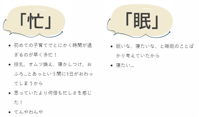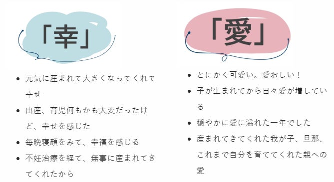 もっとも多く回答されたのが「幸」。子どもを授かったことや生まれてきた我が子を見て幸せを感じる方が多かったようです。2位は「愛」。とにかく可愛い、愛おしいというコメントが多く、家族の愛情を感じます。3位「忙」や10位は「眠」など、日々の目まぐるしさが表れているようです。予想以上にさまざまなことが起こったり、時間に追われたり、子育ての大変さを物語っていますね。同じく10位に「癒」もランクイン。子育ての中にある「癒し」や楽しさが少しでも増えるよう、アカチャンホンポも皆さまの暮らしをサポートしてまいります。