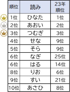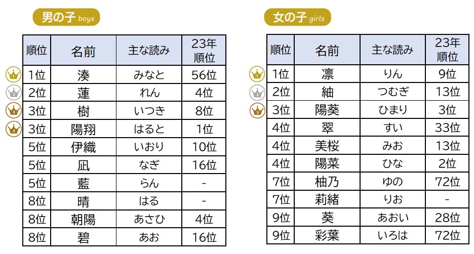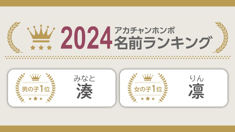 2024年 名前ランキングでは、男の子1位「湊」(みなと)、女の子1位「凛」(りん)のように、男女ともにともに一文字ネームが多いことや、「凪」「晴」「翠」「葵」「桜」のように自然をイメージする名前が多くランクインしました。男の子「湊」(みなと)は2015年から10年ぶりの1位に。他にも今年の活躍が注目されたアスリートの高橋 藍選手の名前と同じ「藍」(らん)がランクイン。近年のランキングで常連となった、大谷 翔平選手の「翔」の字と同様、アスリートの皆さんの活躍が影響しているようです。