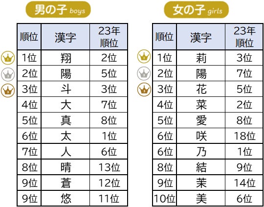 女の子の漢字では、昨年3位だった「莉」が1位に。「莉」や「花」「菜」など、花や植物を表す漢字が好まれているようです。