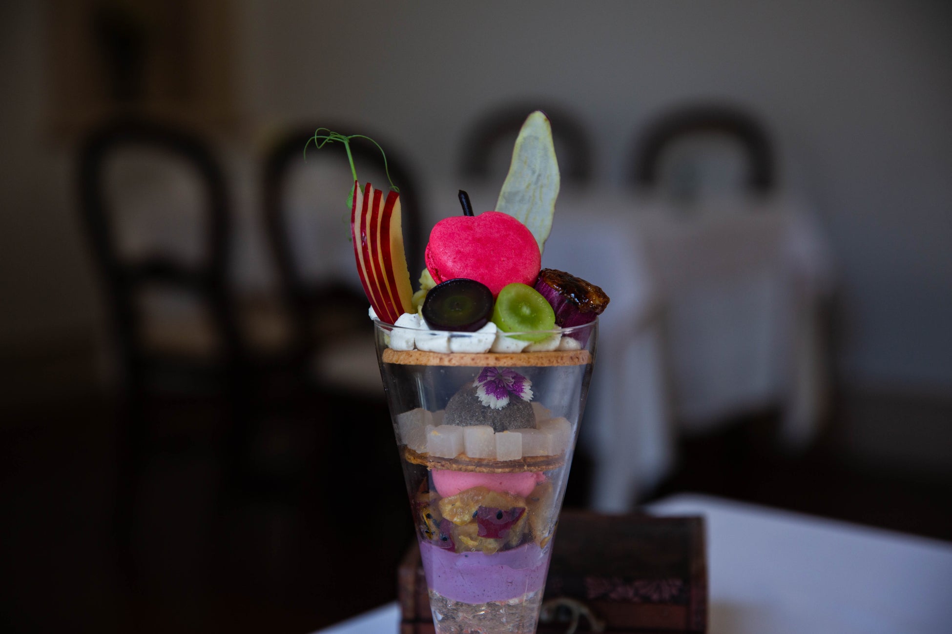 その下の層には食感をお楽しみいただけるかわいい大学芋、カシスのブランマンジェ、キラキラとしたシードルのジュレ、皮ごと使用した紅玉りんごのピューレを重ね、おわりまで秋を堪能出来るパフェに仕上げました。