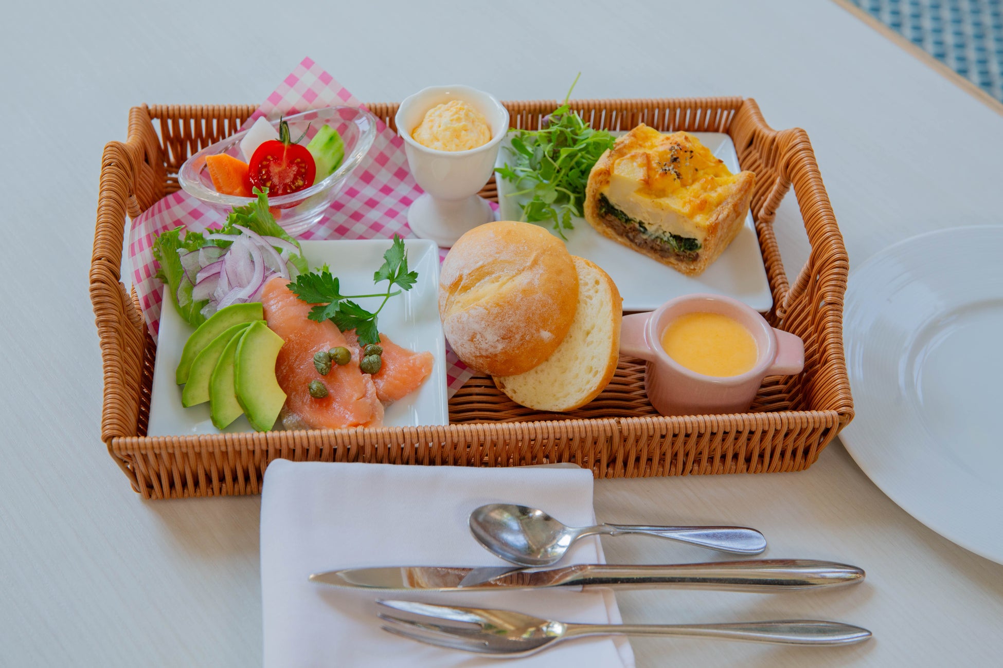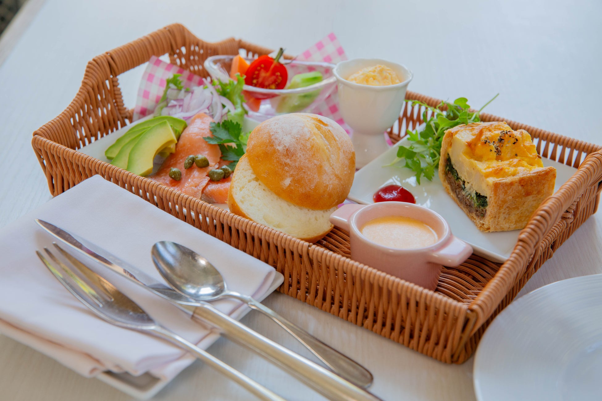 大きなバスケットに盛られたボリューム満点のランチです。お好きなお飲み物とお楽しみいただけるドリンクセットと、贅沢に愉しむシャンパンセットもご用意しました。スモークサーモン&アボカド/テリヤキチキンの2種類からお選びいただけます。