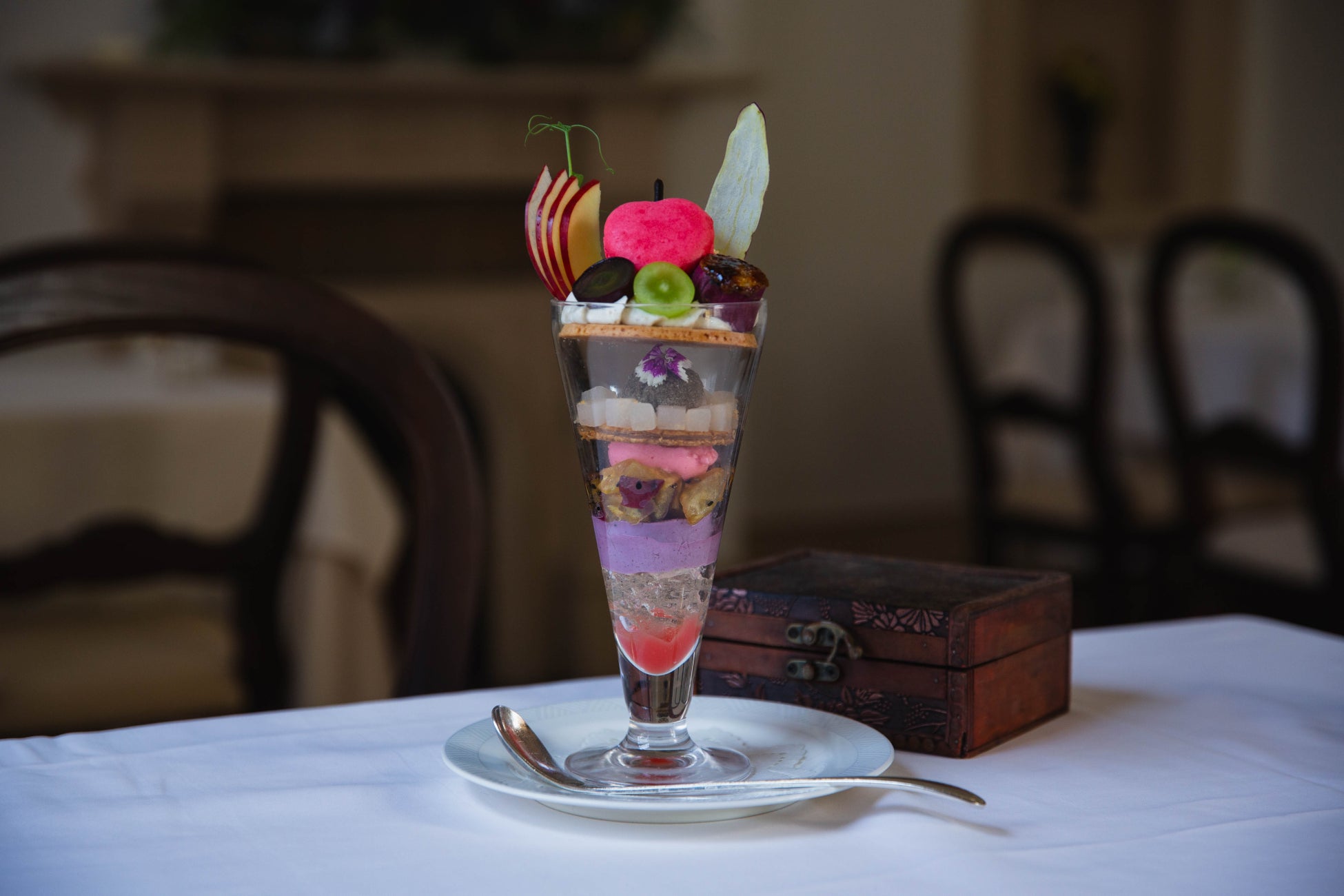 この度、北野異人館 旧ムーア邸では、新作3種のスイーツをご用意。「さつまいもと秋の果実のオータムパフェ」を期間限定で、その他には旧ムーア邸ならではのレトロ感あふれる丸いアイスクリームをのせたカラフルなソーダ、ボリュームたっぷりバスケットのランチを通年でご提供いたします。