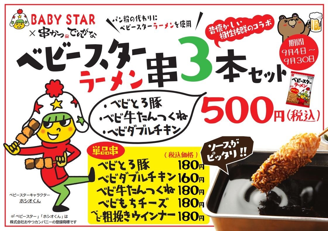 そのまま食べても美味しいベビースターは、実は料理にも使える‟万能おやつ”。そんなベビースターを衣としてまとわせたコラボ串メニュー5種が串かつ居酒屋『串かつ でんがな』とネオ居酒屋『串かつとお酒 でんがな』にて9月4日の『串(くし)の日』より復活します!